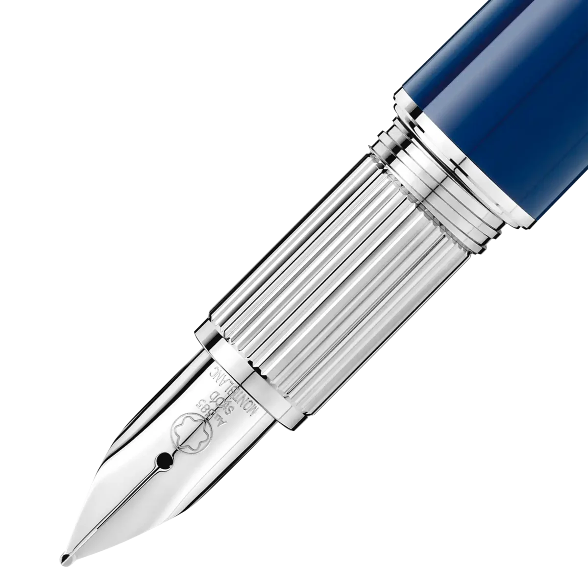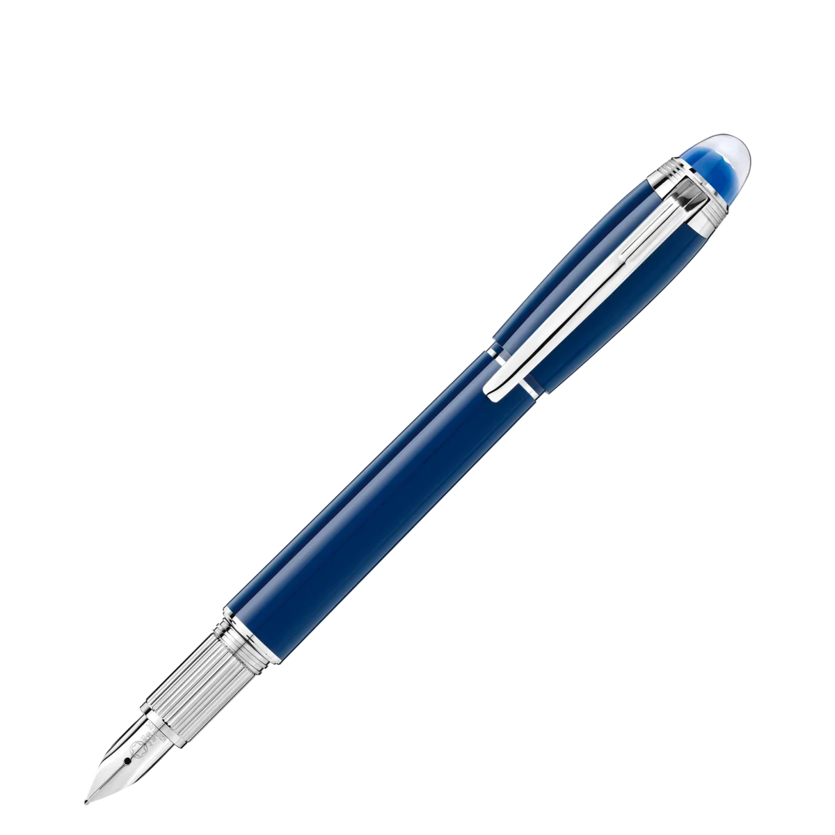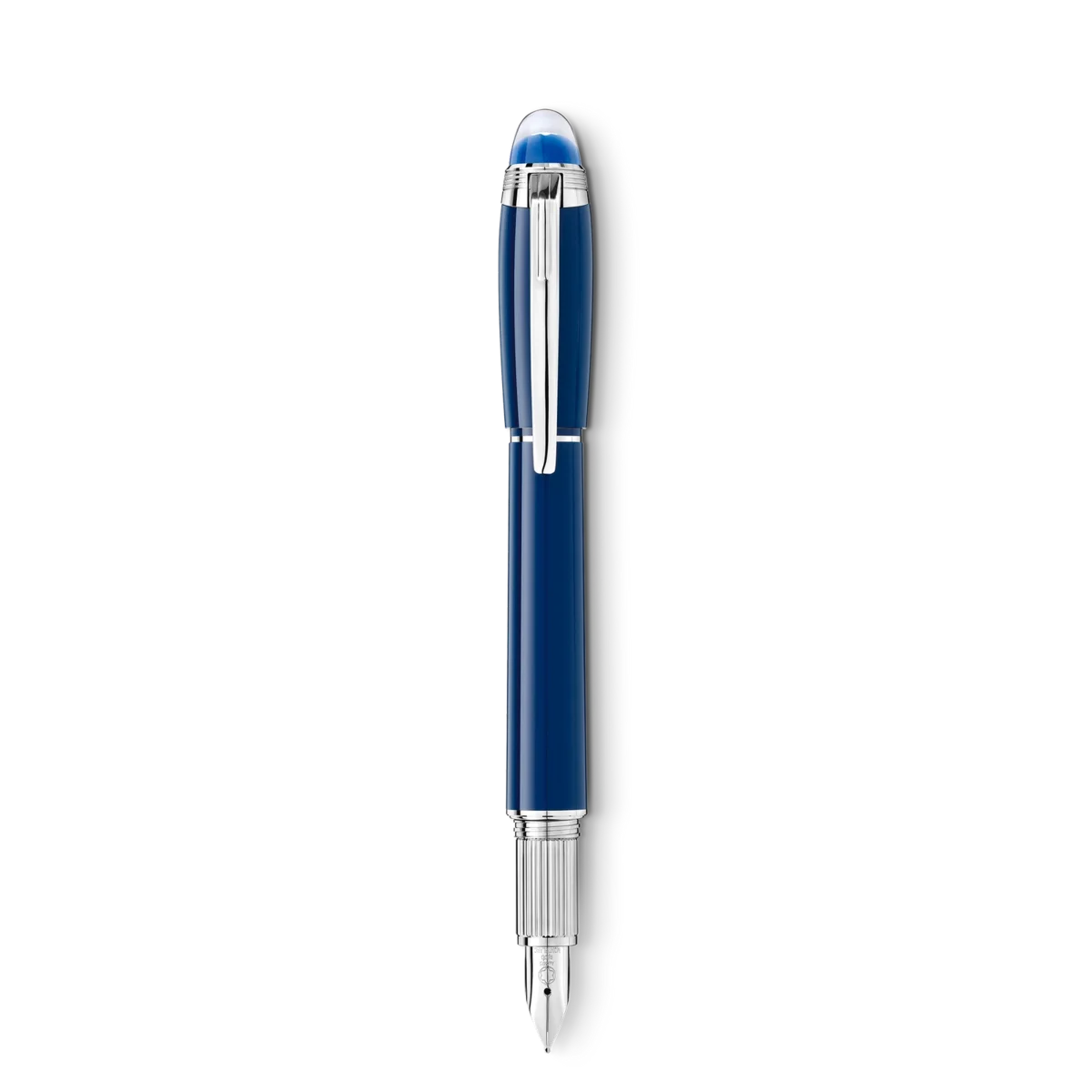 StarWalker Blue Planet handlar om att vandra bland stjärnorna, utforska kosmos och främmande galaxer och vara en del av ett av de mest mystiska och mäktiga äventyr som mänskligheten någonsin har gett sig ut på: utforskningen av rymden. När vi zoomar in på vår planet Jorden hämtar vi inspiration från vattnet, livets källa. StarWalker-emblemet har en blå genomskinlig kupol med en stjärna som svävar ovanpå, vilket representerar jorden som stiger upp över månens horisont sett från månen. StarWalker Precious Resin har platinabelagda detaljer och en blå reservoar och lock i ädelharts. Fyllpennan är handgjord med en rodiumpläterad Au585 / 14K guldspets. Identifikationsnummer MB132438 Fysisk vikt 25,43 g Mått 135,7 mm * 14,9 mm