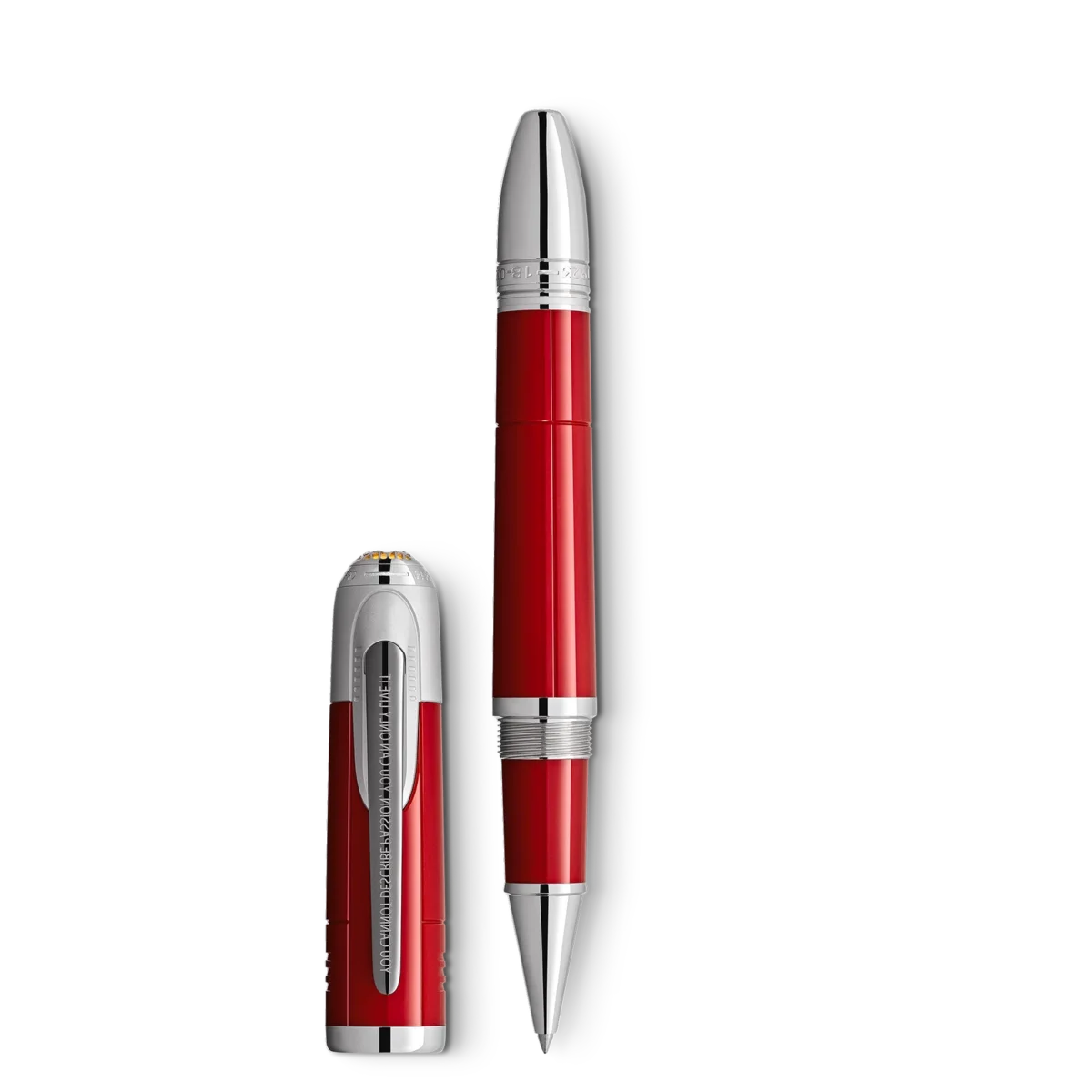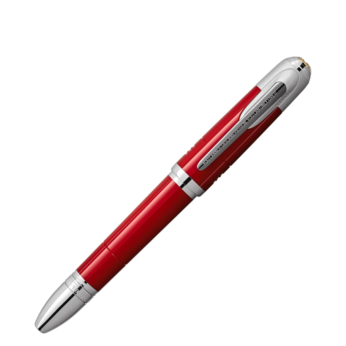 2021 hyllar Montblanc den visionäre Enzo Ferrari: både racerförare och entreprenör. Han grundade den legendariska Scuderia Ferrari och byggde upp ett globalt bilimperium vars namn har blivit synonymt med superb kvalitet och passion för hastighet. Tillverkad av röd ädelharts symboliserar denna utgåva början på Enzo Ferraris passion för motorsport. Färgen är inspirerad av ”Rosso 70 Anni”, en speciell röd färg som representerar olika ikoniska röda nyanser genom åren och som först utvecklades för att fira Scuderia Ferraris 70-årsdag. Kapsylens topp pryds av ett Montblanc-emblem inbäddat i ett metallgaller på en gul yta, som en hyllning till Ferraris födelseort. Modena, Italien. Den stegrande hästen, det berömda emblemet för Ferrari-bilar, är avbildat på baksidan av locket. Metallklämman är prydd med ett berömt citat av Enzo: ”Du kan inte beskriva passion, du kan bara leva den.” Konan visar två viktiga datum i Enzo Ferraris tidiga karriär. Identifikationsnummer MB132145 Fysisk vikt 55,12 g Mått 147,5 mm * 17,5 mm