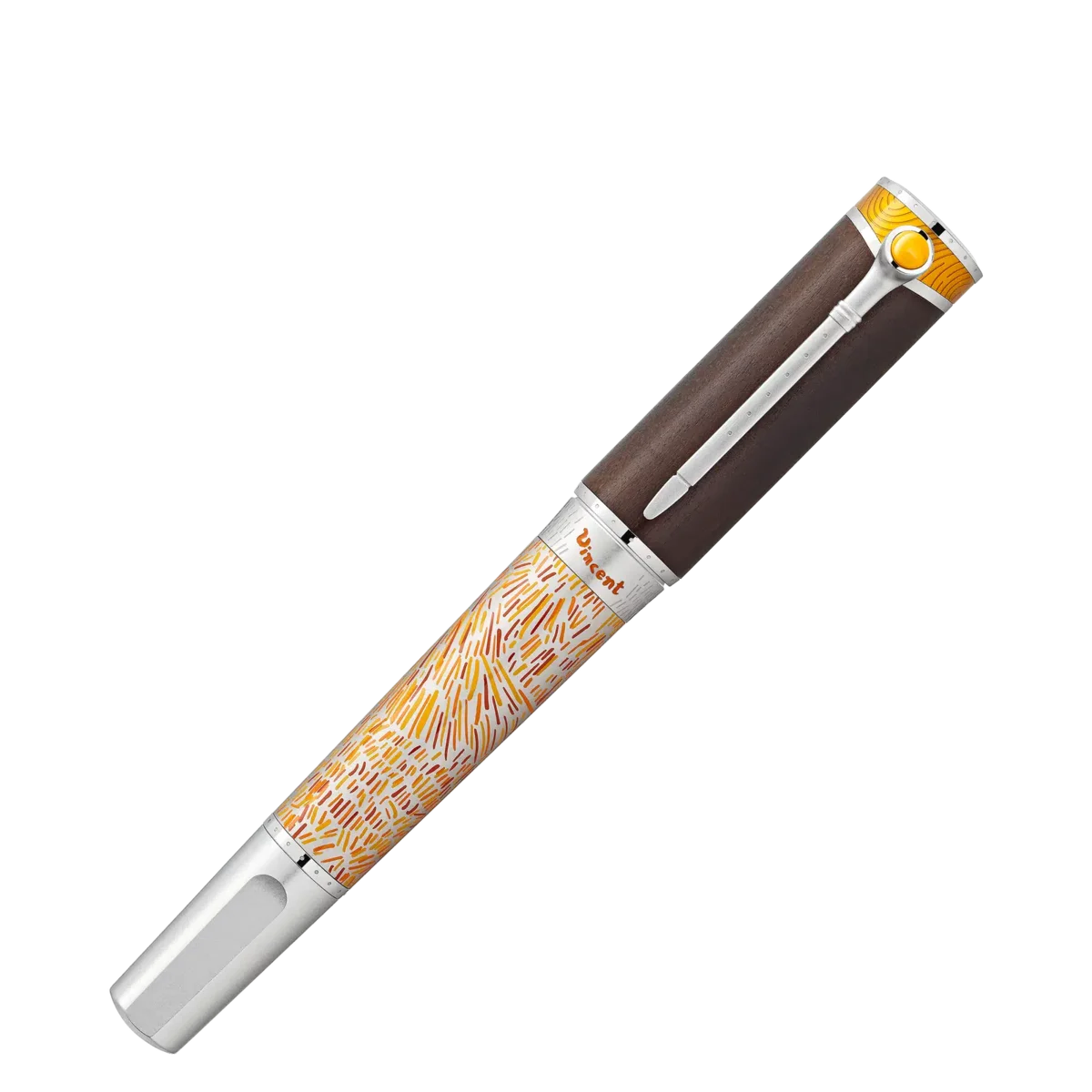 Med Montblanc Masters of Art Homage to Vincent van Gogh Limited Edition 4810 hyllar Montblanc Vincent van Gogh, en av de mest populära målarna från slutet av 1800-talet. Denna utgåva betonar särskilt hans tid i Arles med designdetaljer som återspeglar de provensalska vetefälten och en av hans mest kända målningar, ”Solrosor”.Årtalet 1888 är ingraverat på pennkroppen – bredvid Vincents signatur i klar orange – för att minnas året då han flyttade till Arles. Pennkroppen är dekorerad i gula och orange nyanser som återspeglar de soliga landskapen i södra Frankrike som förevigats i Van Goghs verk. Van Gogh utvecklade en lösare, friare stil och blev lika skicklig med pensel som med palettkniv – som han använde för att skapa tjocka, impulsiva ”impasto”-verk. Hans palettkniv inspirerade den platinabelagda klämman, medan hans svepande penseldrag är förevigade i den gula lacken på lockets ovansida. Dessutom fångas hans förkärlek för piprökning, som han hänvisade till i många av sina självporträtt, i en subtil detalj på klämman: den övre delen är formad som en pipskål och fylld med gul ädelharts. Som en hyllning till Vincents fascination för traditionella japanska träsnitt är den övergripande formen inspirerad av en japansk träsnittskniv, medan locket är tillverkat av trä.Editionen kröns av ett Montblanc-emblem tillverkat av gult ädelt harts. Identifikationsnummer MB129156 Fysisk vikt 106,1 g Mått 147,9 mm * 18,1 mm