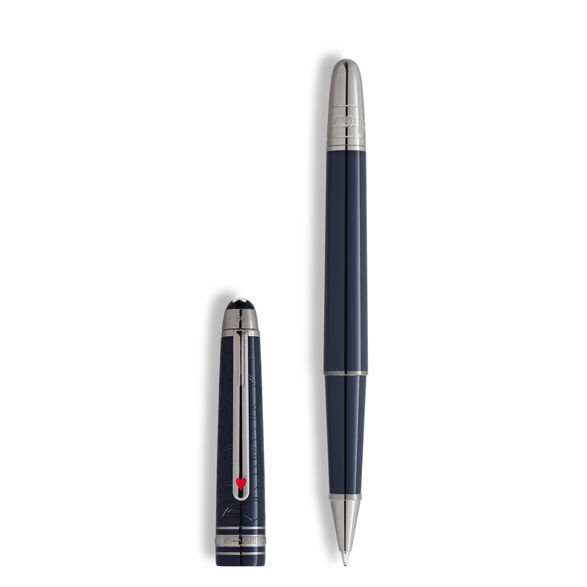 Meisterstück Around the World in 80 Days-kollektionen är inspirerad av Jules Vernes berömda äventyrsroman. Classique Rollerball, prydd med mörkblå ädelharts, berättar om Mr Fogg och Passepartouts episka resa. När de ger sig ut på den sista etappen från Yokohama tillbaka till London via USA, korsar duon den vidsträckta amerikanska kontinenten med tåg. Upptäck de intrikata detaljerna – ett tåg elegant lasergraverat på locket, ett säkerhetskedjemönster på konen, som speglar ett avgörande ögonblick när Passepartout kopplar loss tåget från loket för att rädda besättningen som attackerats av Sioux.Kepsens design fångar tryckventilerna och den böljande röken från lokomotivet, medan klämman pryds av ett rött lackerat hjärterkort, som symboliserar föreningen mellan Phileas Fogg och prinsessan Aouda. Dessutom representerar korten Foggs djärva satsning att fullborda resan på bara 80 dagar. På kepsens ovansida finns en präglad tidslinje över resan – 36 dagar från Yokohama till London, som kulminerar i totalt 80 dagar runt jorden.