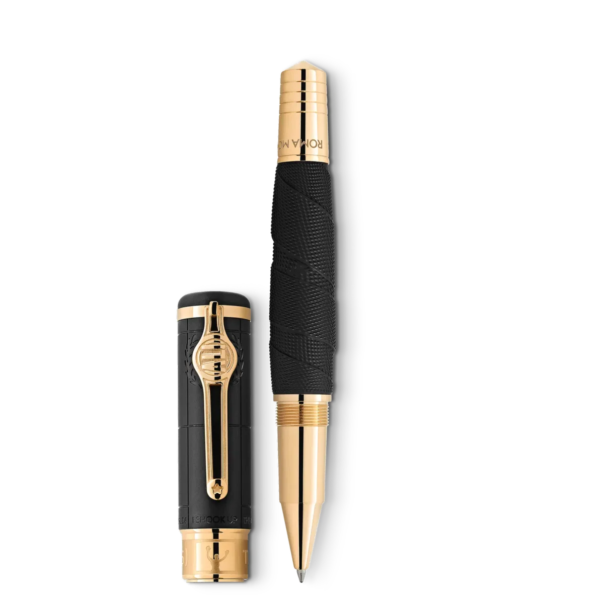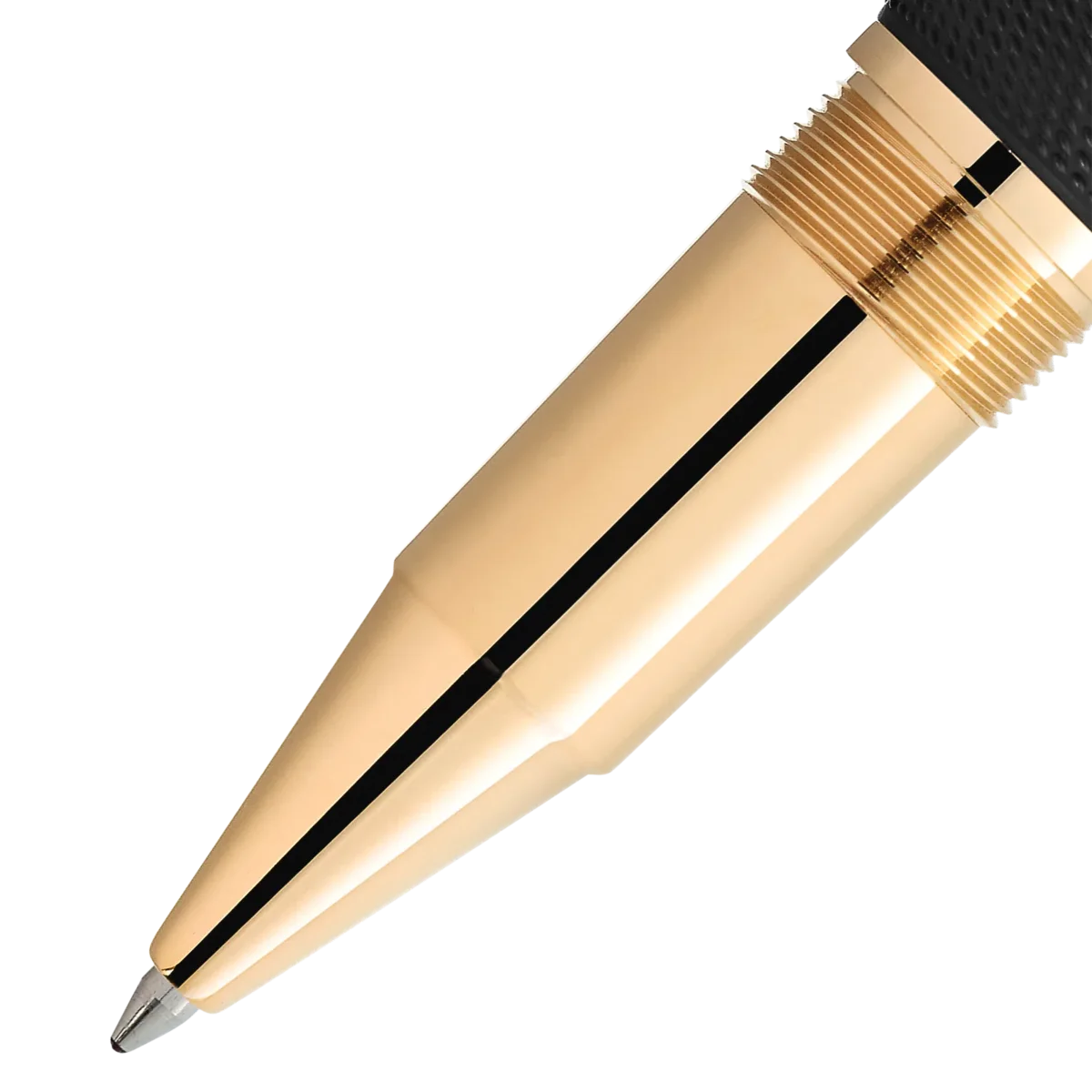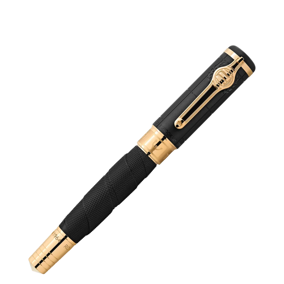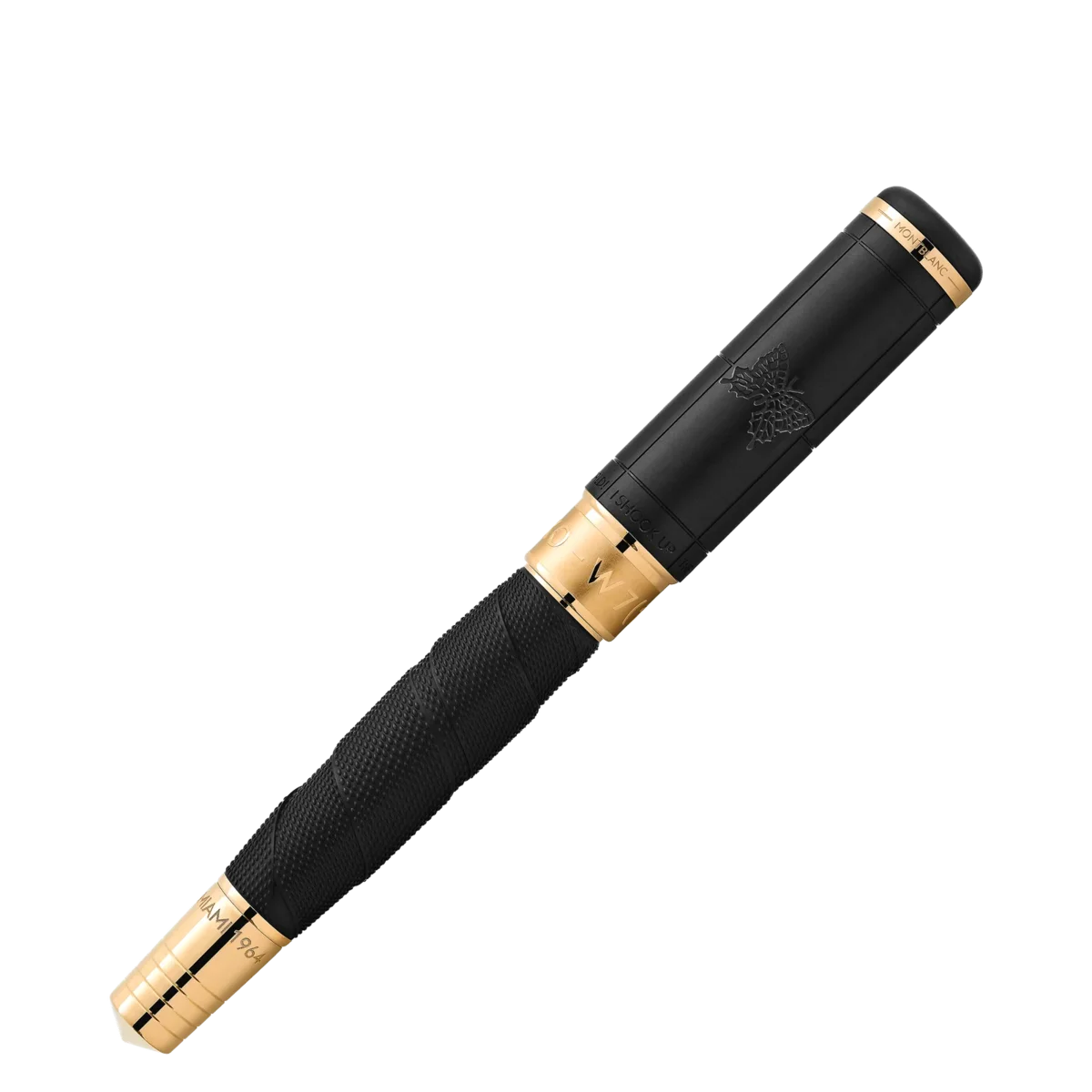 Det är få idrottare som hyllas och hedras som den trefaldige världsmästaren i tungvikt, Muhammad Ali, vars legendariska ögonblick inom idrott och medborgarrättsaktivism gjorde honom till en av 1900-talets mest inflytelserika idrottare och humanitärer. Som idrottsman skakade Ali om världen med sin styrka, skicklighet och personlighet och blev världsmästare i tungvikt vid bara 22 års ålder. Hans största triumf var dock hans humanitära insatser. Kåpan är tillverkad av dyrbar svart harts och liknar en boxningssäck, medan pennkroppen ser ut som den boxningstejp som idrottsmän använder för att linda in händerna. Kepsens design innehåller olika element, såsom ett berömt utrop av Ali och en fjäril inspirerad av hans typiska kampstil: ”Float like a Butterfly, sting like a bee” (Sväva som en fjäril, stick som ett bi). Den spetsiga konen tar upp denna idé och är graverad med fyra linjer som representerar boxningsringens rep. Inskriptionerna på konen hänvisar till Alis seger vid OS i Rom 1960 och hans första världsmästerskap i tungvikt som han vann i Miami 1964. Detaljerna om hans seger, nämligen att han vann i sjunde ronden genom teknisk knockout, finns på pennkronans ring. För att fira hans första titel är Montblanc-emblemet i vit harts prydd med en ”1”. För att understryka denna framgång är klämman formad som ett boxningsmästarbälte och bär hans namn. Identifikationsnummer MB129334 Fysisk vikt 63,37 g Mått 147 mm * 17,3 mm