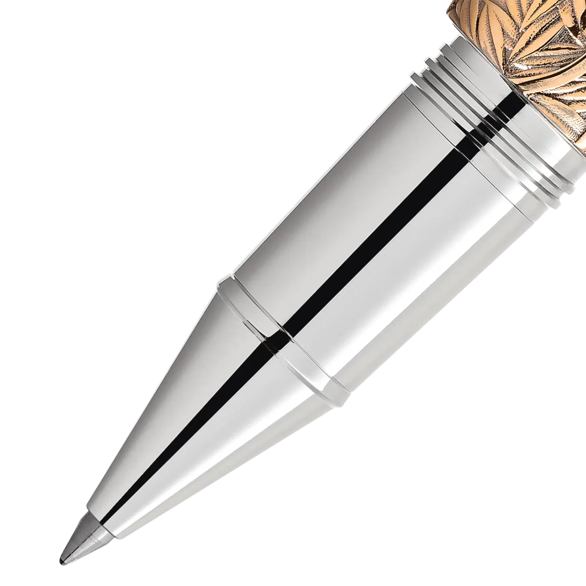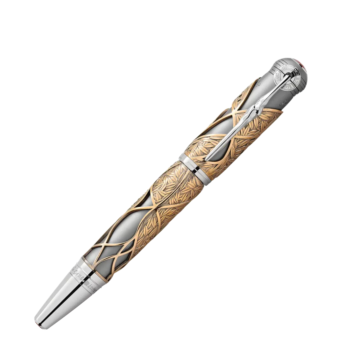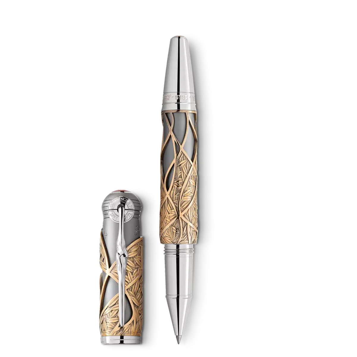 ”Det var en gång…” Montblanc Writers Edition Homage to the Brothers Grimm är tillägnad Jacob och Wilhelm Grimm och hyllar deras arbete med tyska och europeiska folksagor, bland vilka finns några av de mest kända sagorna som ”Snövit”, ”Askungen” och ”Törnrosa”. Skrivinstrumentets övergripande silhuett är formad som en gammal vandringsstav. Denna utgåva är tillverkad av metall med en speciell vintagebeläggning och har hämtat inspiration från sagan om ”Törnrosa”, vilket framgår av de sammanflätade bladen och törnen runt locket och pennkroppen. Kåpan kröns av Montblanc-emblemet i ädel pärlemor. Den platinabelagda klämman, som påminner om en knölig träbit, avslöjar överraskande silhuetten av bröderna Grimms profil när den vrids.