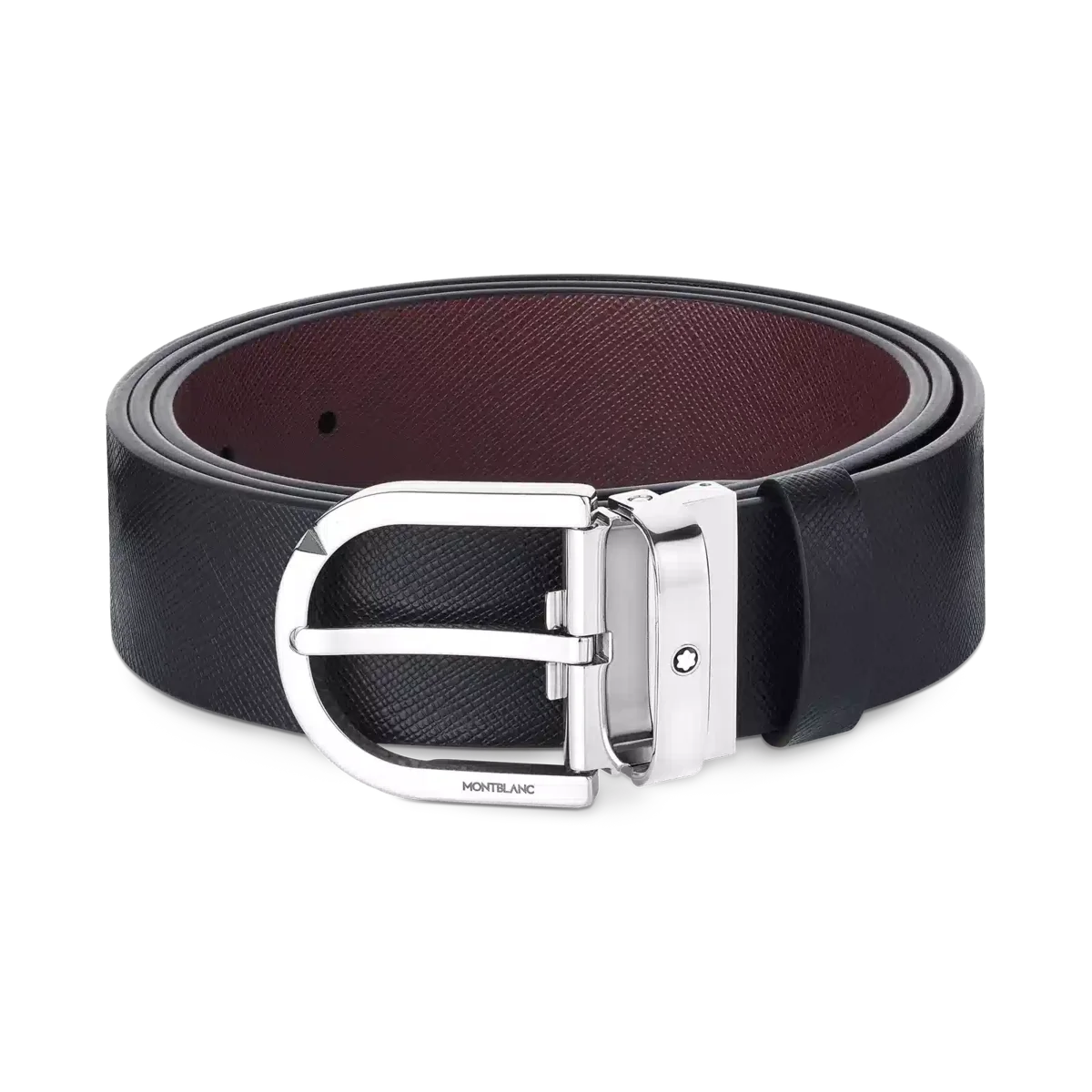 Detta mångsidiga och djärva vändbara 35 mm läderbälte med Saffiano-tryck är det rätta valet för dig som inte är rädd för att lämna avtryck. Spännet med hästsko har en lättöppnad mekanism och passar perfekt till både den svarta och den vinröda sidan av bältet.