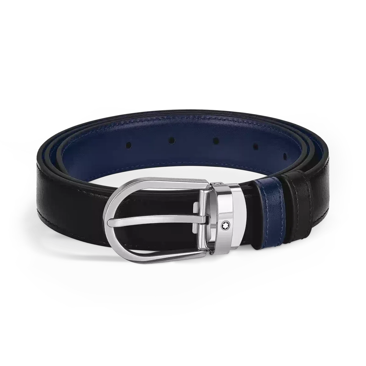 Upptäck alla detaljer om det svarta/blå 30 mm vändbara läderbältet med hästskospänne. Handla online i Montblancs officiella butik.