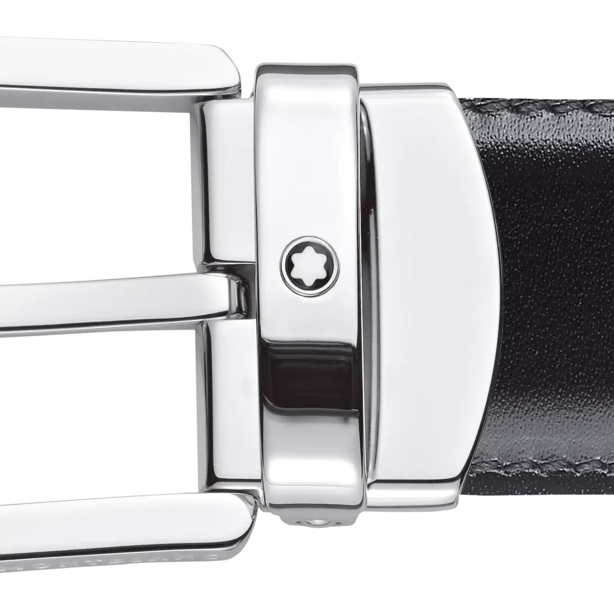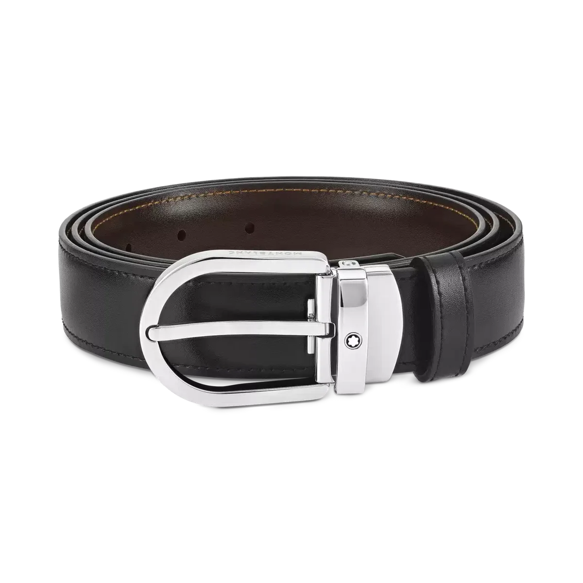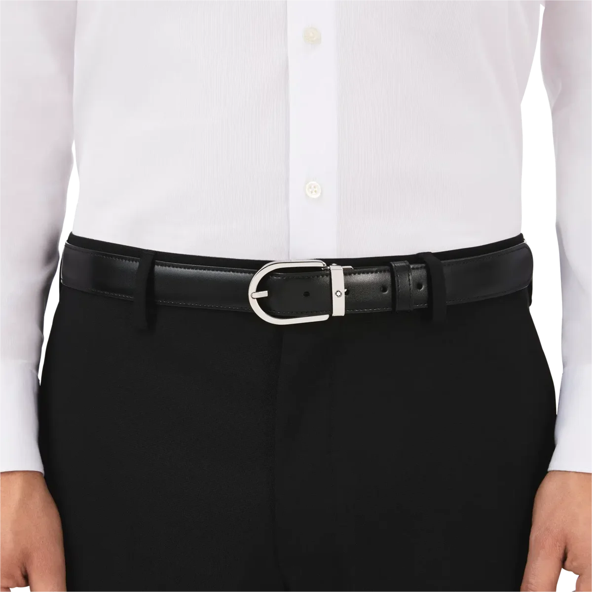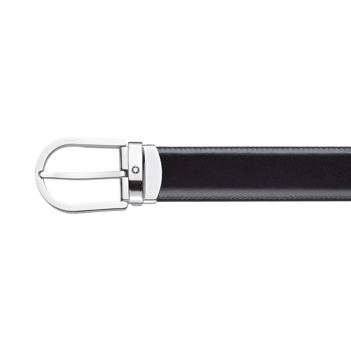 Glänsande hästskospänne med palladiumfinish, graverat Montblanc-varumärke på sidorna och Montblanc-emblem. Självjusterbar, 3 cm x 120 cm, vändbar svart/brun läderrem. Raffinerad och diskret, passar alla typer av look. Identifieringsnummer MB128135 Mått 1200 mm * 30 mm * 5 mm