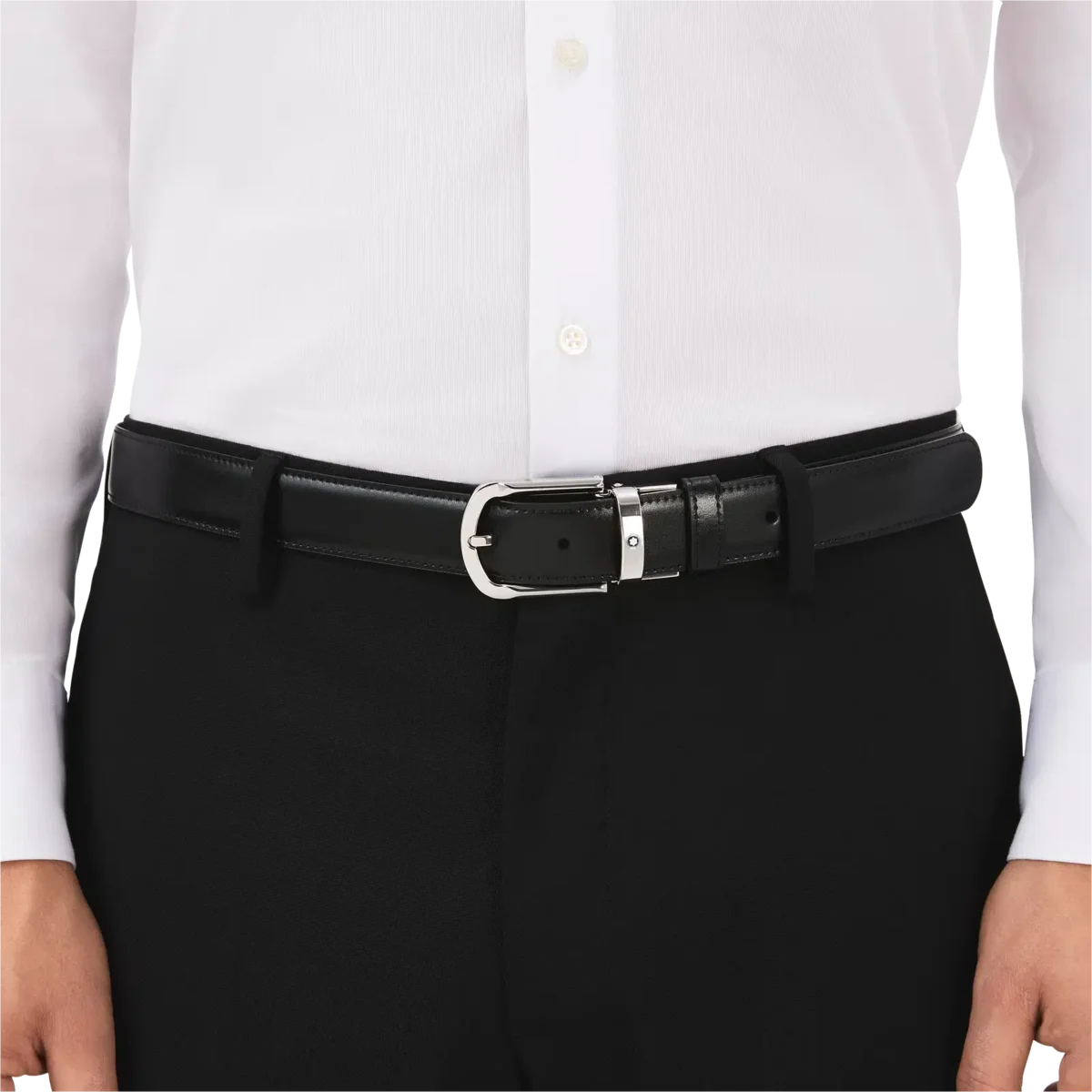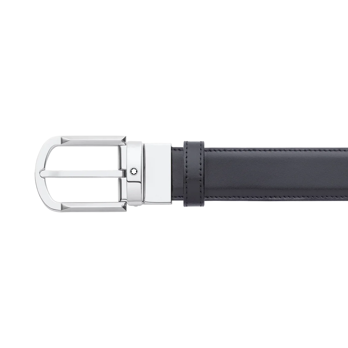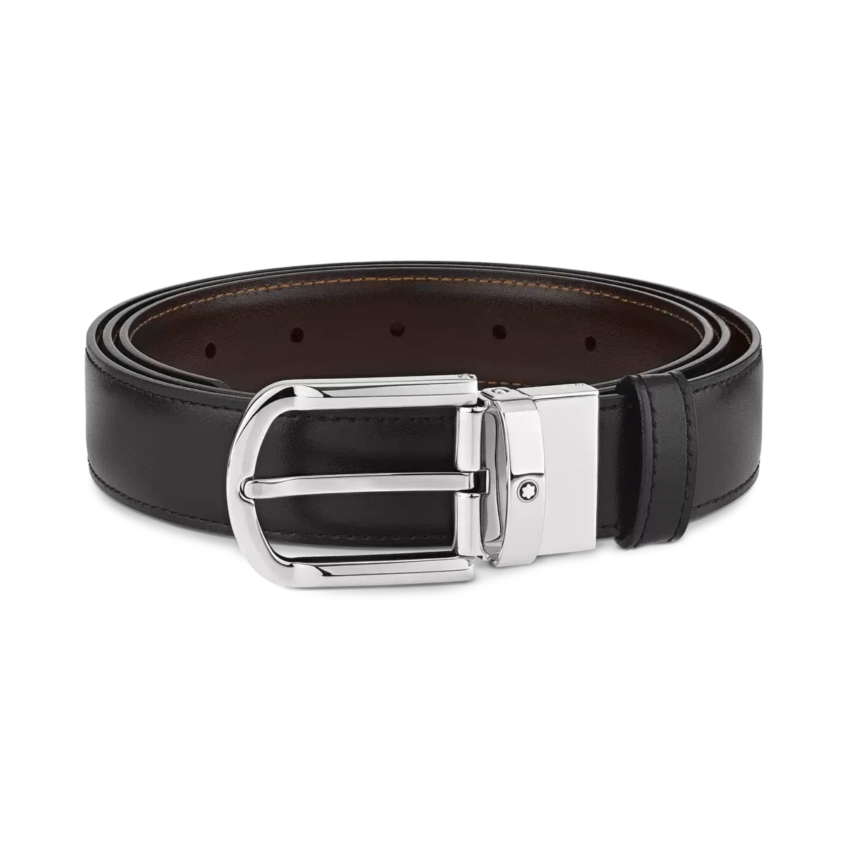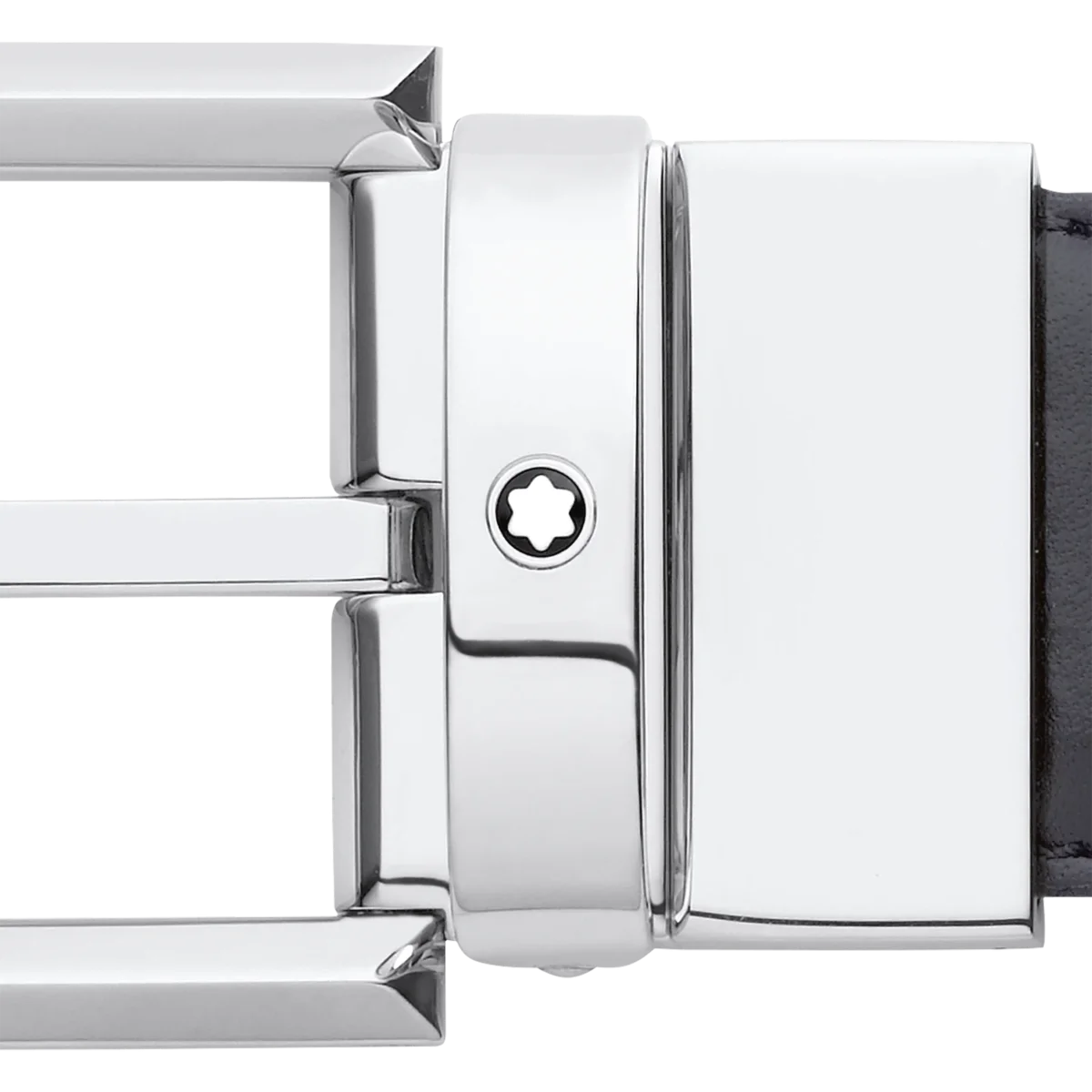 Glänsande palladiumbelagd, rundad hästskospänne med Montblanc-emblem. Självjusterbart, 3 cm x 120 cm, vändbart svart och brunt läderband.