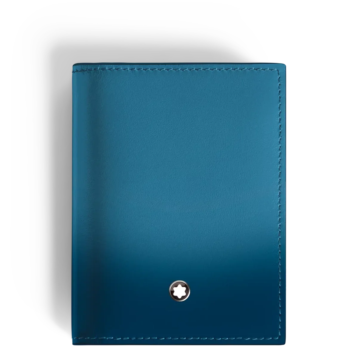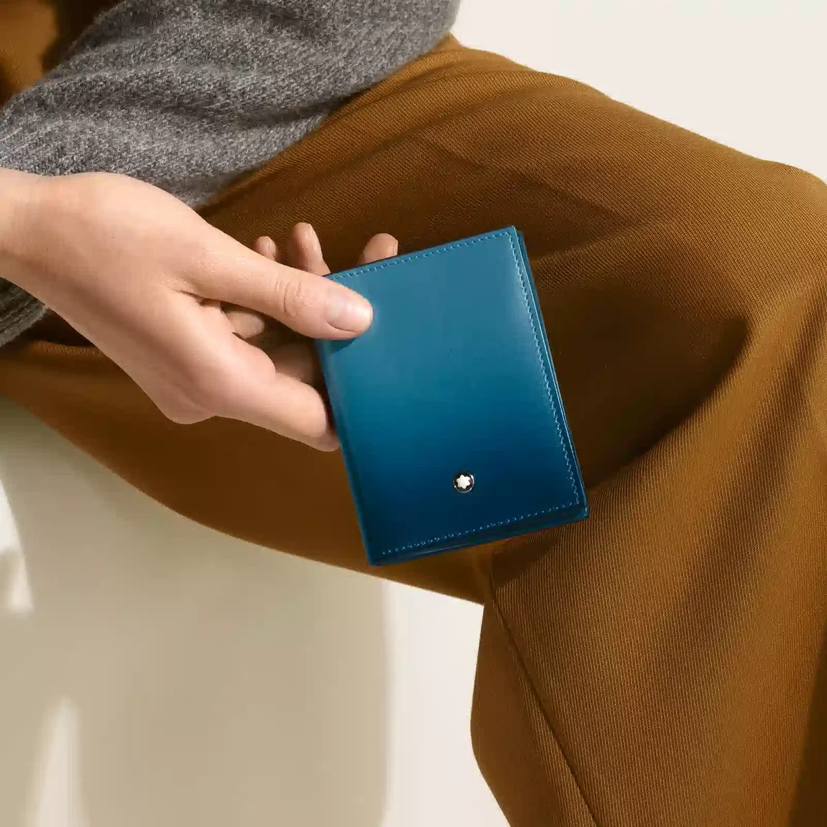 Denna sofistikerade korthållare är designad som en livskamrat och har ett fack för visitkort samt plats för fyra kreditkort. Tillbehöret är tillverkat i lyxigt rökblått läder med en manuellt applicerad sfumato-effekt och är försedd med Montblanc-emblemet på framsidan.