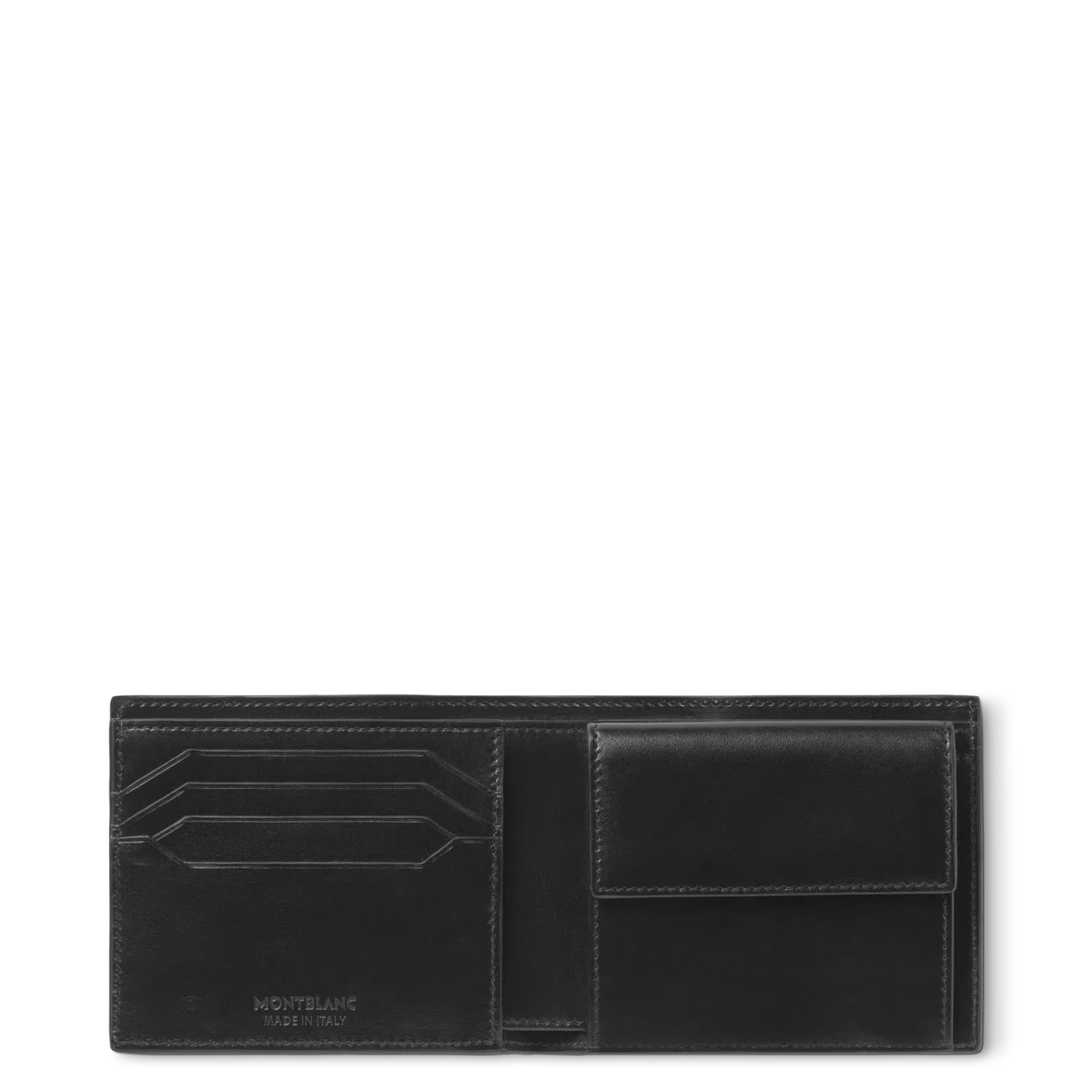 Meisterstück 4cc är en kompakt läderplånbok med en ficka med lock för mynt som kombinerar diskret elegans med praktisk funktionalitet. Plånboken är designad för dina vardagsnödvändigheter och har fyra kreditkortsfack, två fack för sedlar, ett myntfack och ett extra fack för kvitton. Den är tillverkad av elegant läder och fodrad med svart tyg och har Montblanc-emblemet som finish.