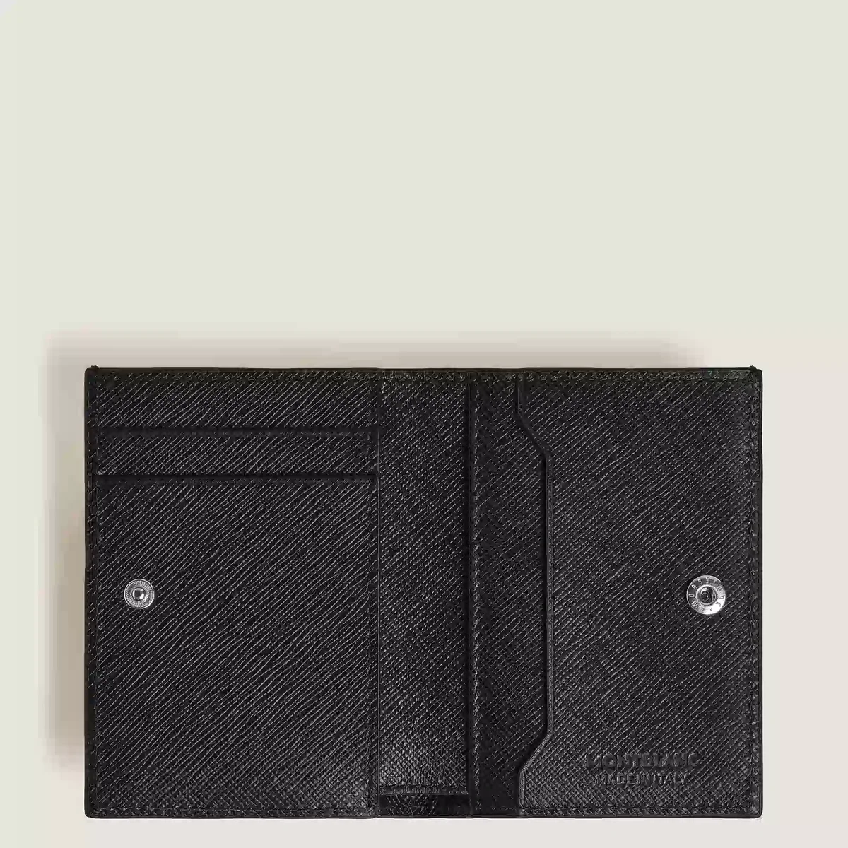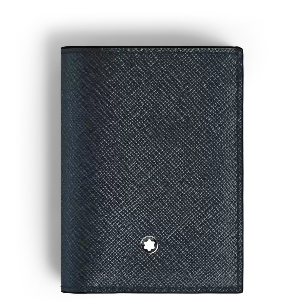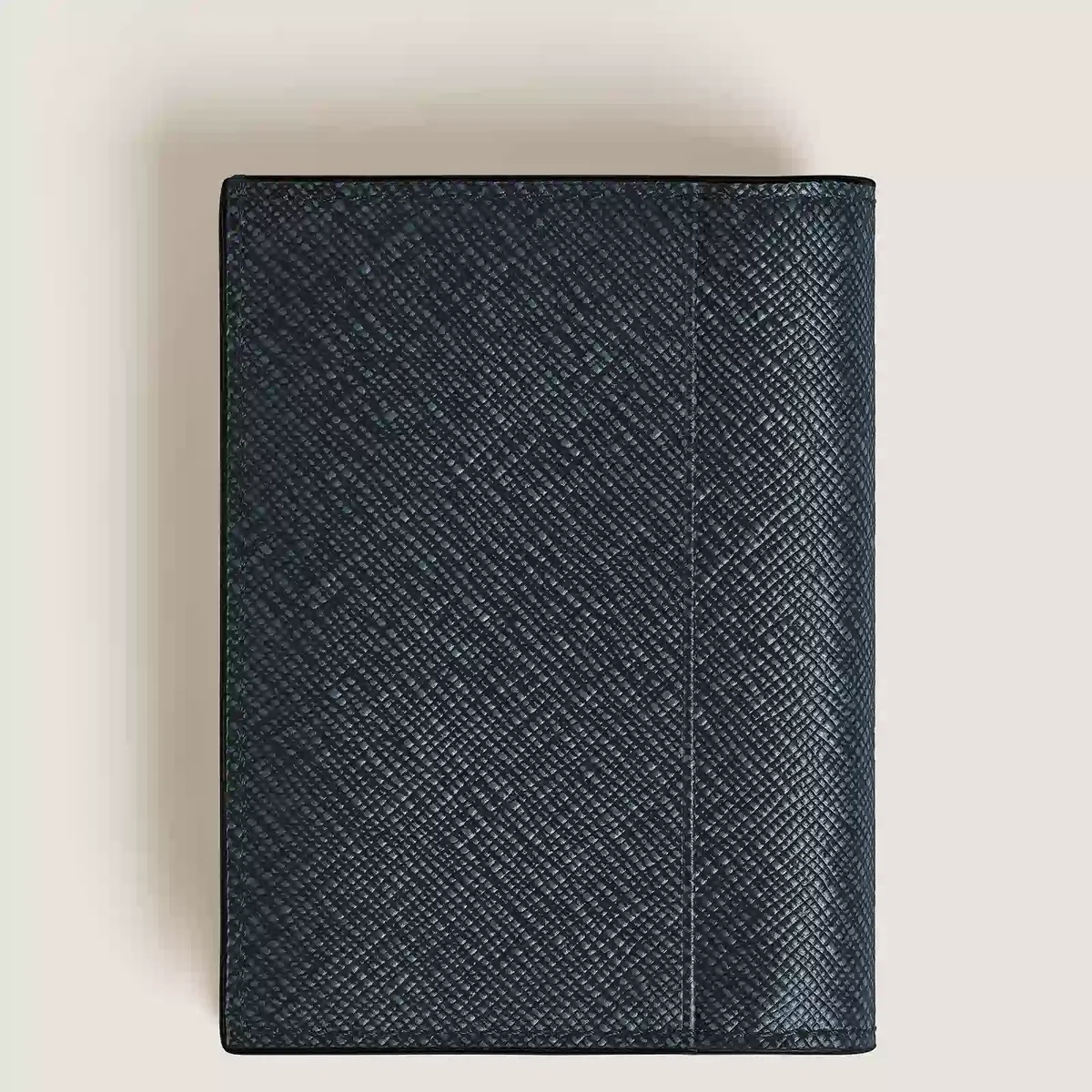 Denna kompakta och eleganta minilplånbok är tillverkad av präglat läder i en elegant kombination av blått och svart. Den är idealisk för dig som föredrar att resa lätt. Den eleganta silhuetten öppnas och avslöjar tre kreditkortsfack, ett sedelfack och två extra fickor, så att du enkelt och elegant kan bära med dig alla dina nödvändigheter.