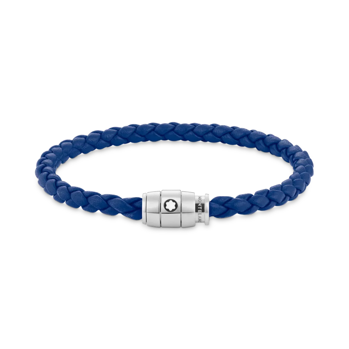 Smycket, vävt av blått läder, har ett spänne av polerat rostfritt stål med en ring i stål med Montblanc-emblemet.