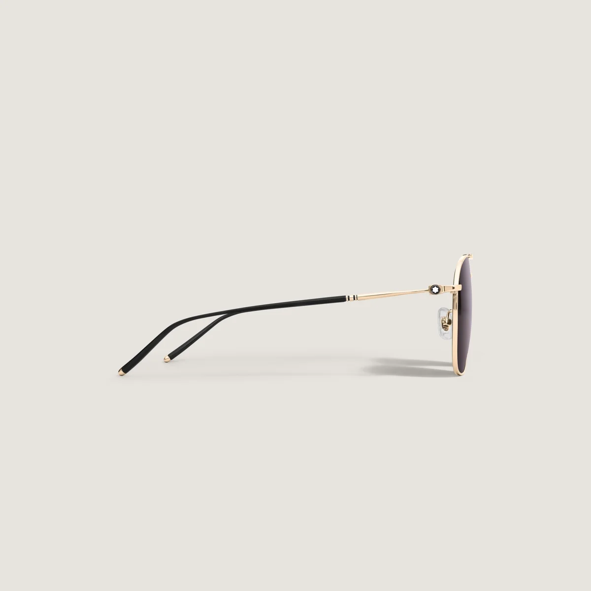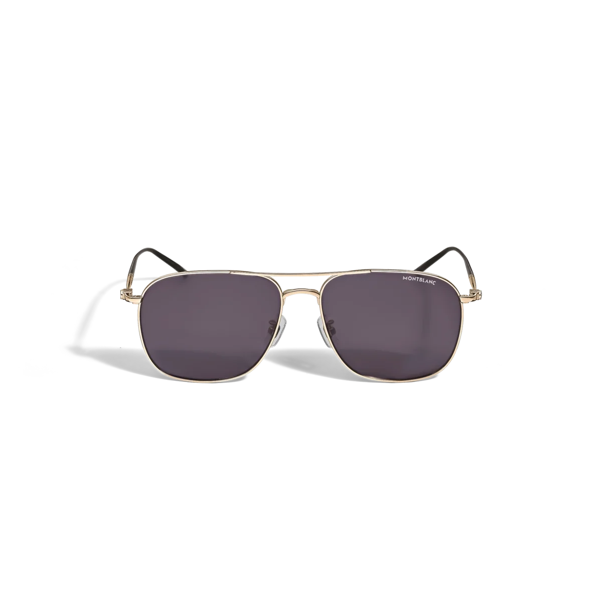 Dessa solglasögon i fyrkantig stil har en guldfärgad metallbåge och gråa linser. De har en dubbel metallbrygga på framsidan. De rörformade skalmarna är inspirerade av Meisterstück-skrivinstrumenten och förgylls med en detalj med tre ringar. Montblanc-logotypen är lasergraverad på vänster lins och en svart emaljdetalj är infattad i ändarna. Identifieringsnummer: MB135563