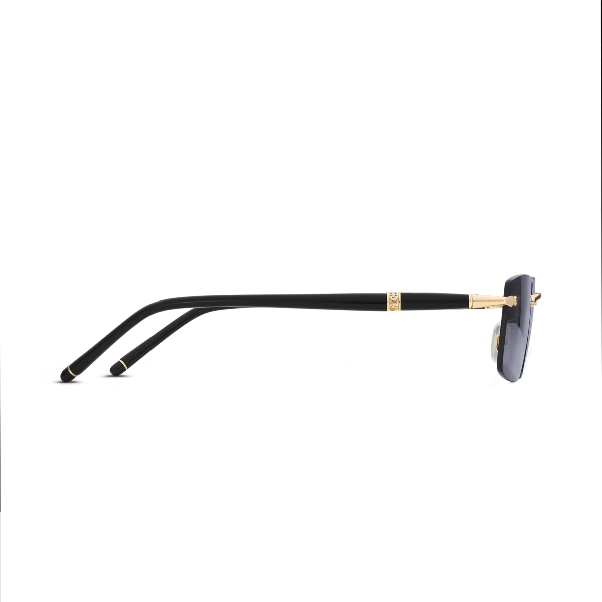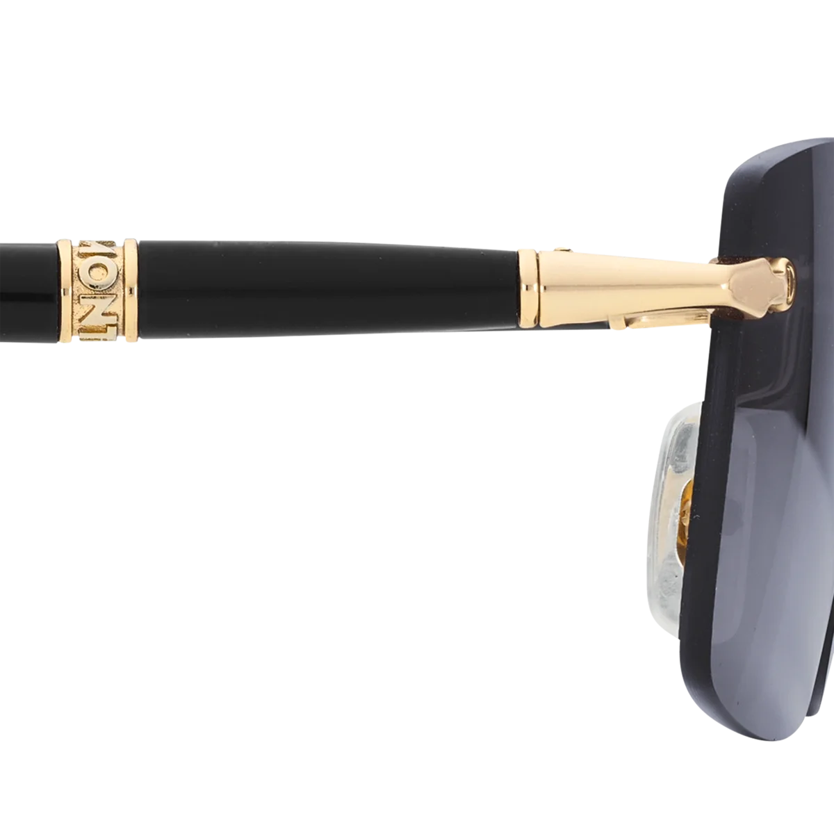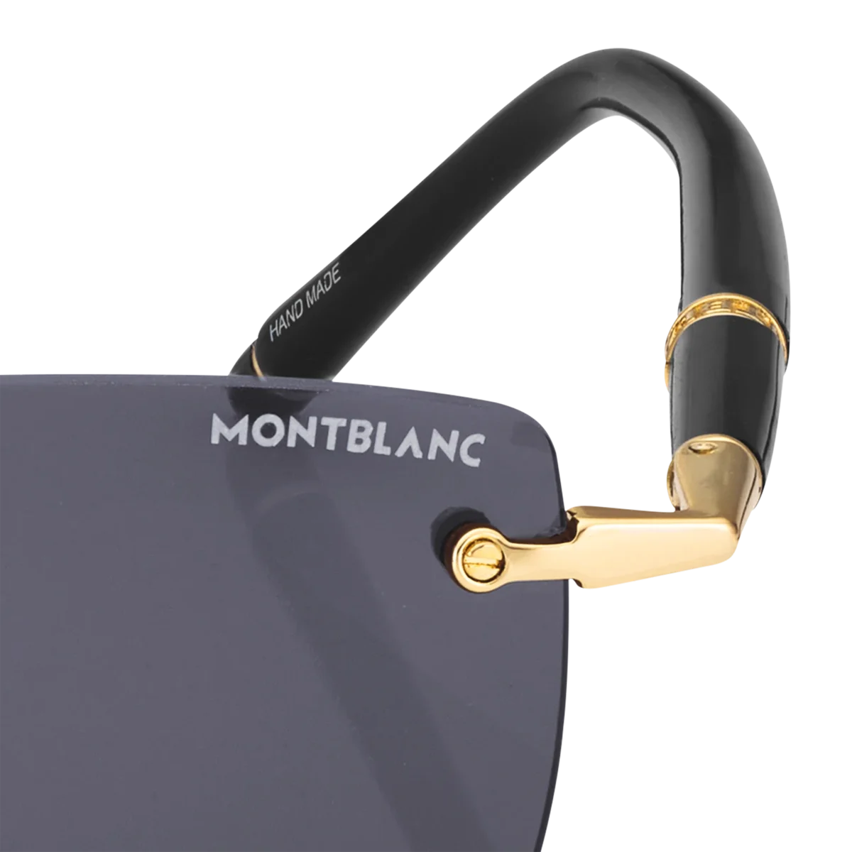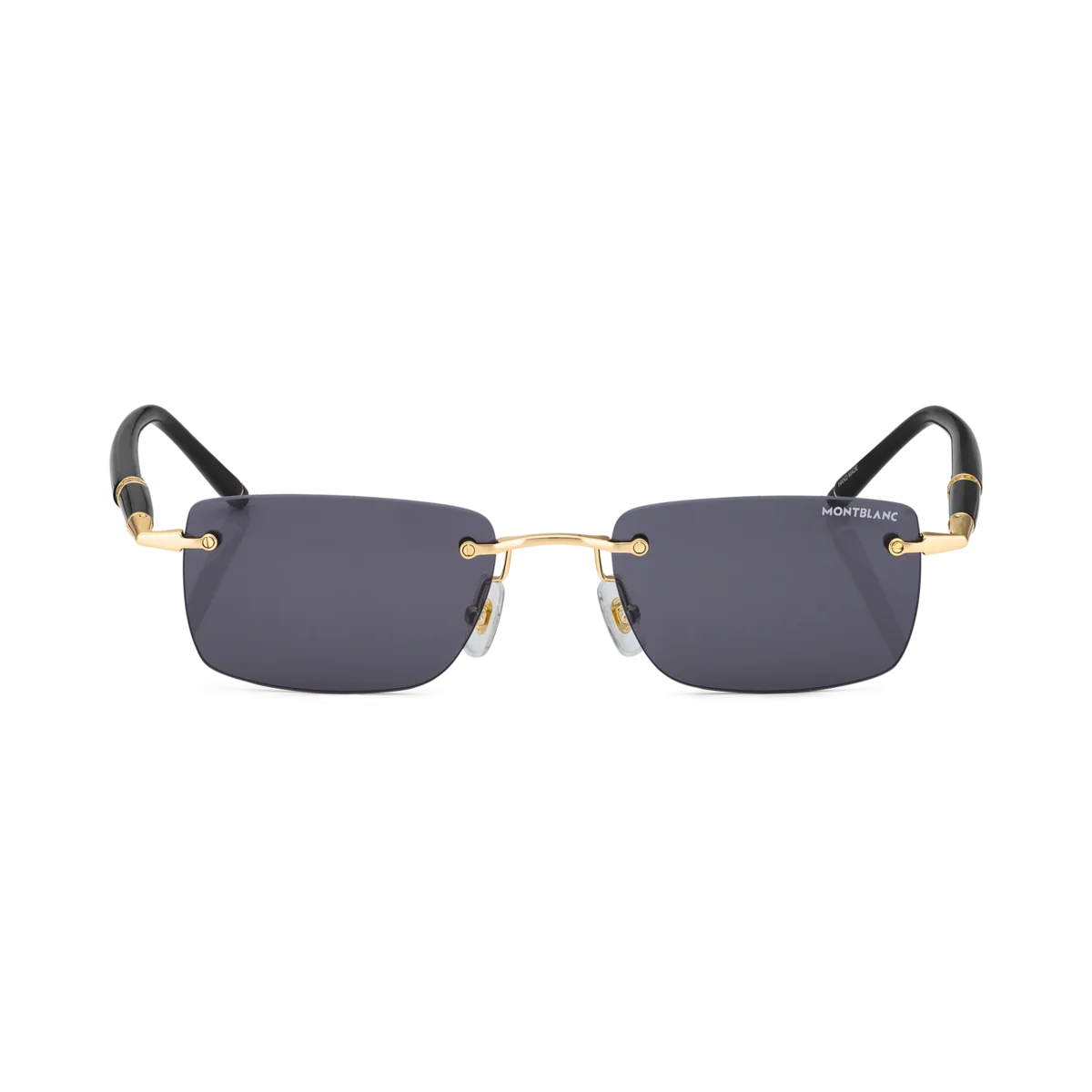Dessa kantlösa rektangulära solglasögon har en guldfärgad metallbåge och gråa linser. De rörformade skalmarna är inspirerade av Meisterstück-skrivinstrumenten och förgylls med en detalj med tre ringar och emaljdetaljer på ändarna. Montblanc-logotypen är lasergraverad på vänster lins.