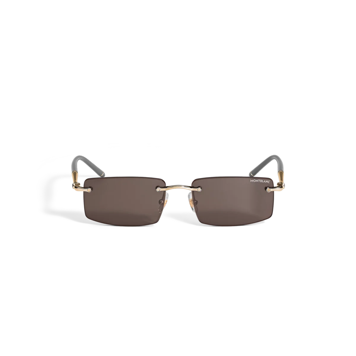 Dessa kantlösa solglasögon i fyrkantig stil har en guldfärgad metallbåge och bruna linser. De rörformade skalmarna är inspirerade av Meisterstück-skrivinstrumenten och förgylls med en detalj med tre ringar. Montblanc-logotypen är lasergraverad på vänster lins och en svart emaljdetalj är infattad i skalmarna.