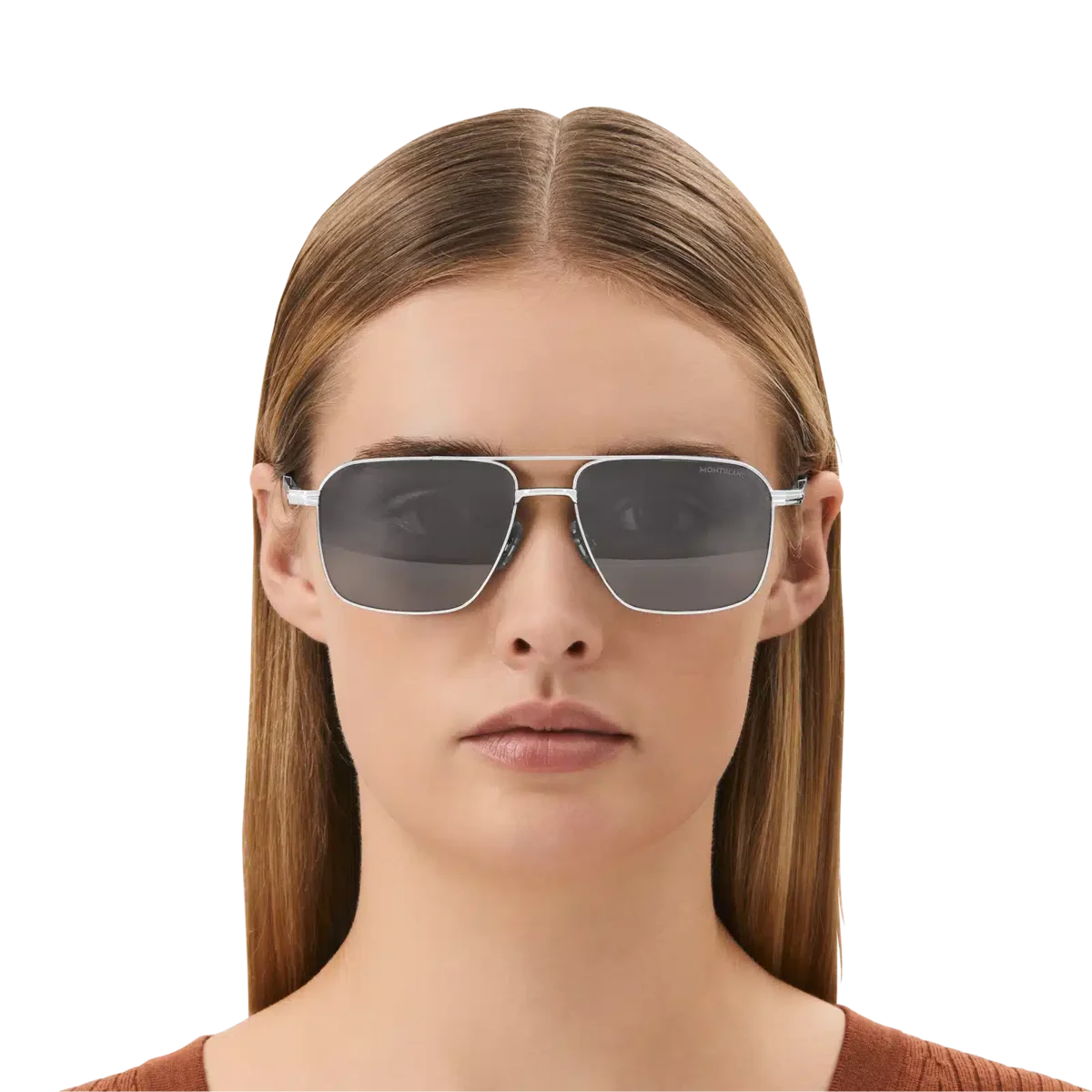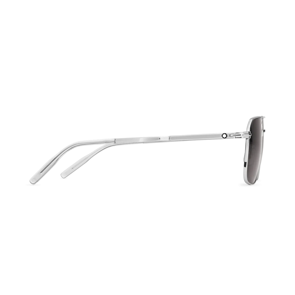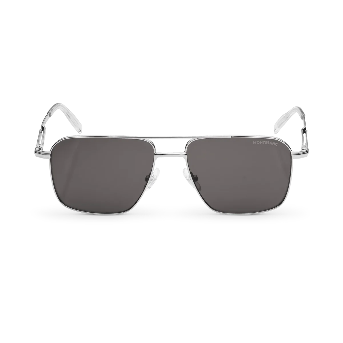 Dessa rektangulära solglasögon har en silverfärgad metallram och gråa linser. De har en dubbel metallbrygga på framsidan. Den silverfärgade klämdetaljen är det centrala elementet i skalmsdesignen. Den hyllar ett viktigt element i Meisterstück-skrivinstrumentet, som också gör det möjligt att hänga bågen på fickan. Det snötäckta Montblanc-emblemet är infattat i klämdetaljen på skalmen och Montblanc-logotypen är lasergraverad på vänster lins. Identifieringsnummer: MB131313
