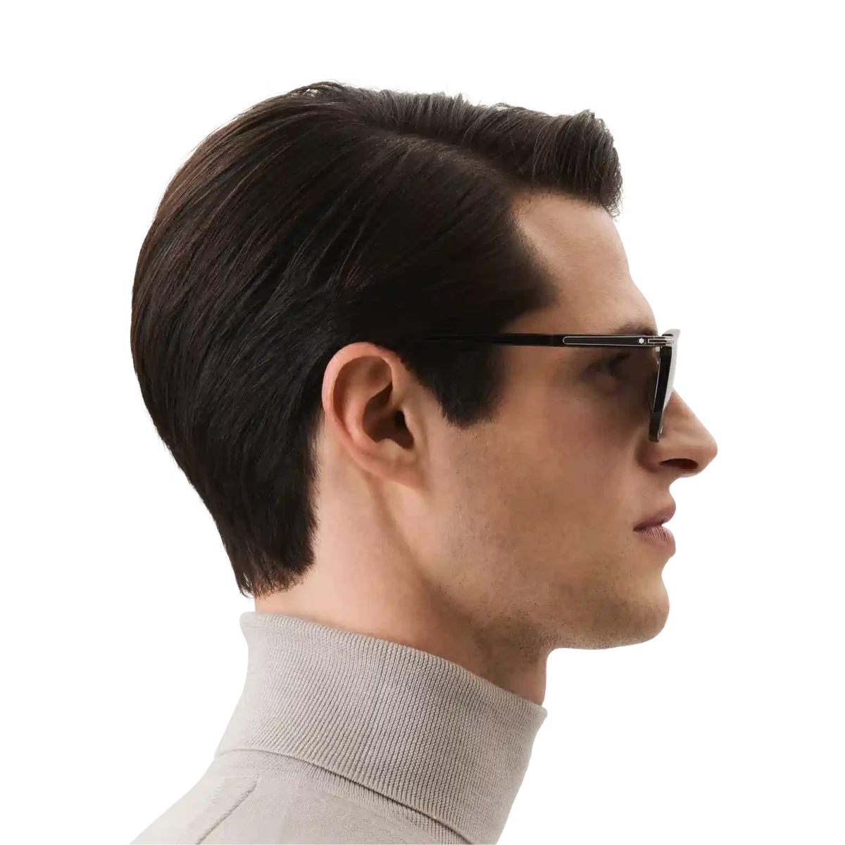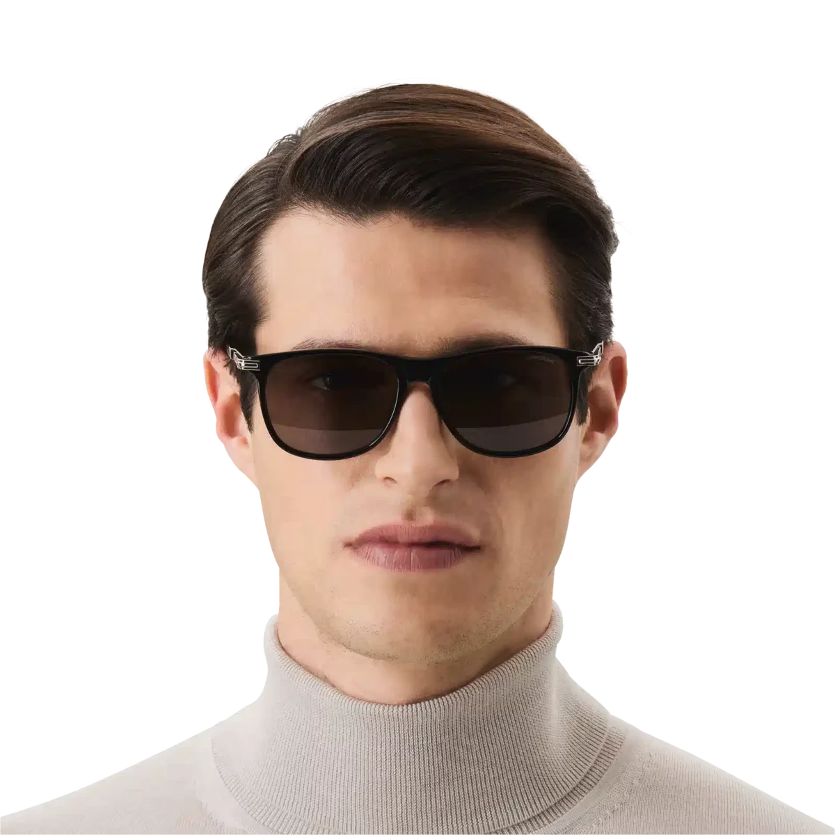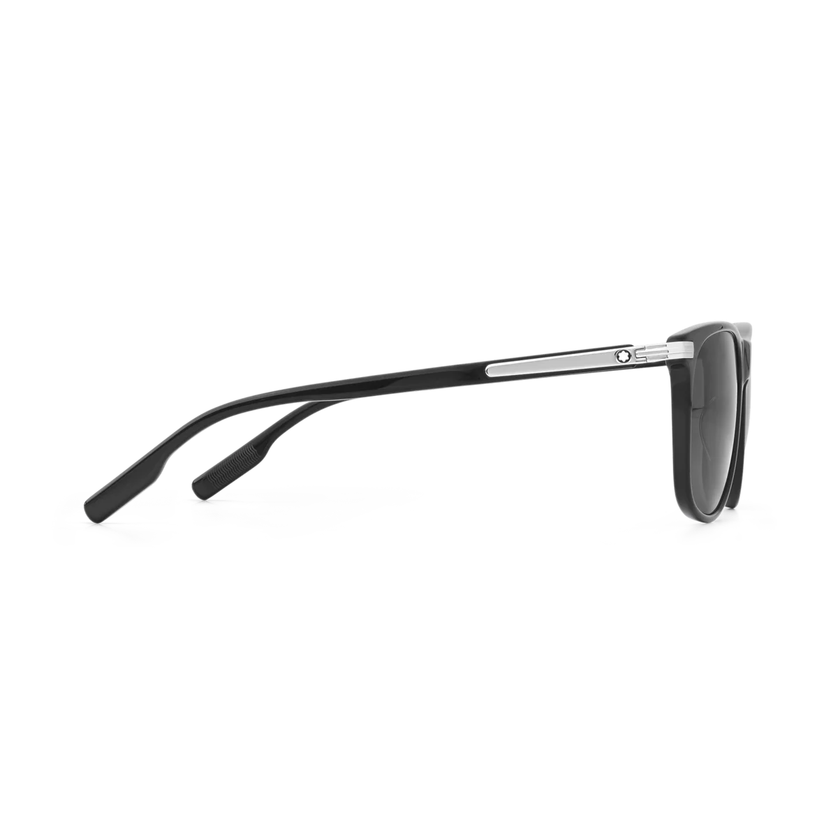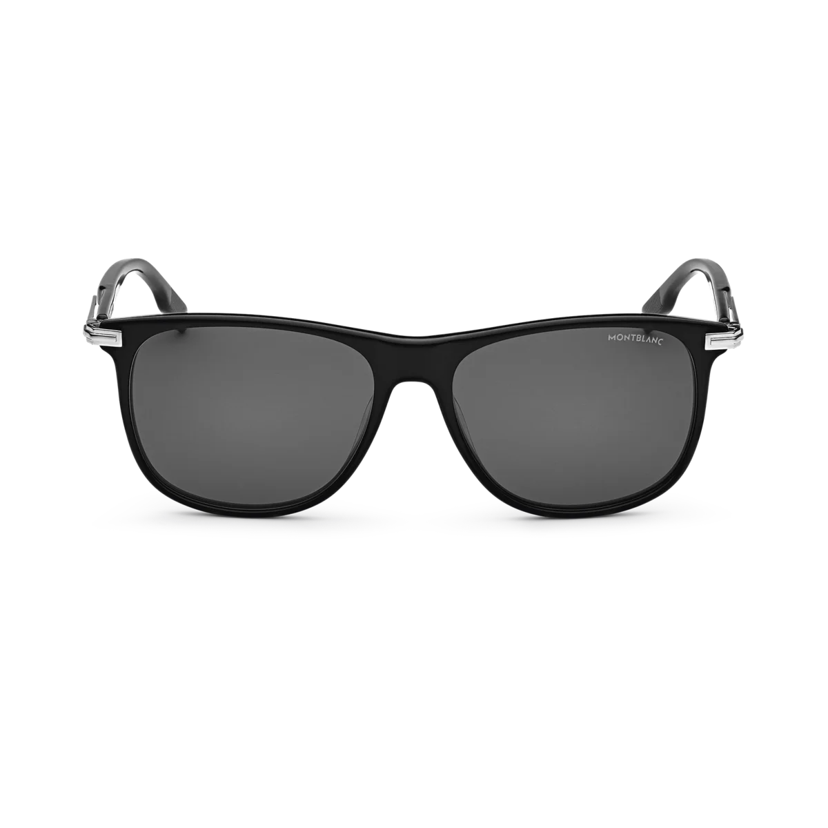 Dessa solglasögon i rektangulär stil har en svart acetatbåge och grå linser. Klämdetaljen är det centrala elementet i skalmarna och är både estetisk och funktionell, eftersom den gör att du kan hänga bågarna på fickorna. Montblanc-emblemet med snövit topp är inneslutet i klämdetaljen på skalmarna och Montblanc-logotypen är lasergraverad på det vänstra glaset. Identifieringsnummer: MB129804