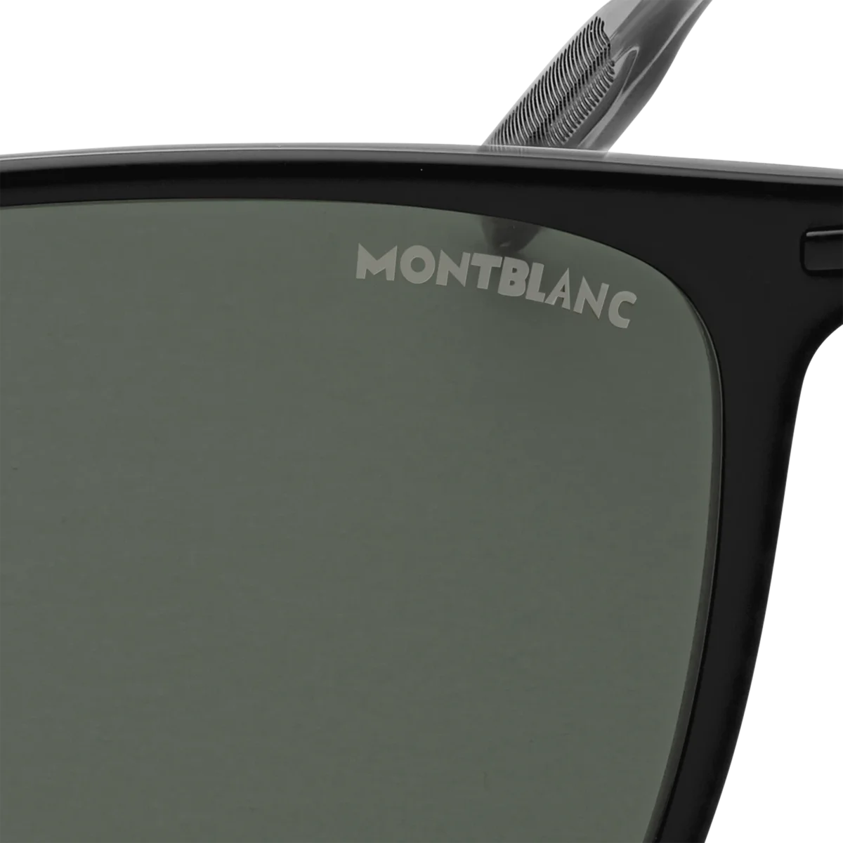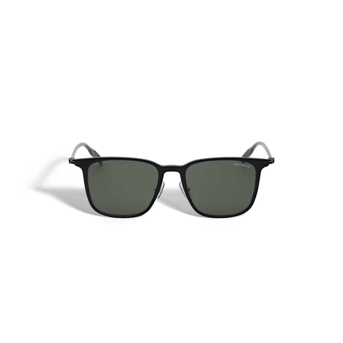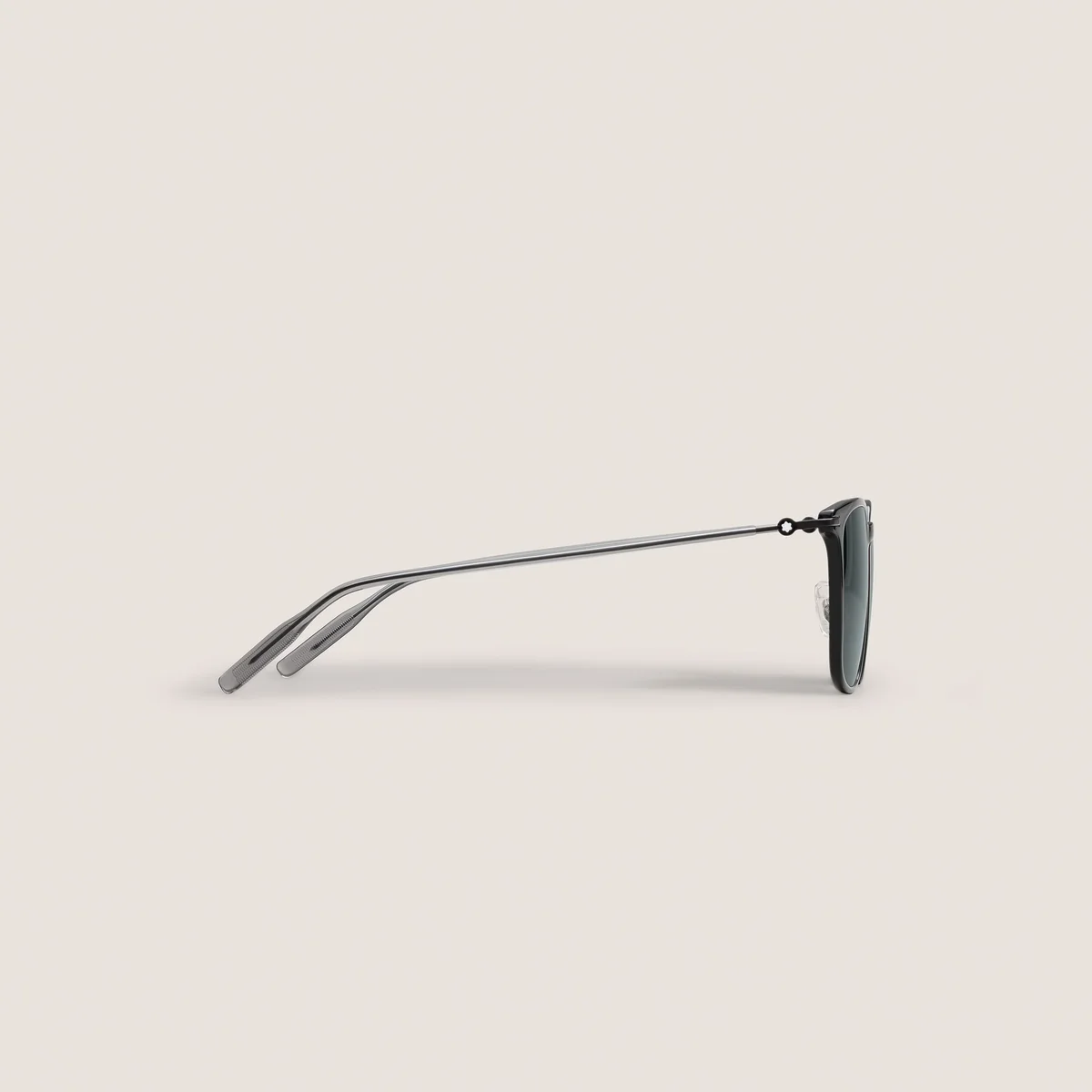 Dessa solglasögon i rektangulär stil har en svart injicerad ram och grå linser. Montblanc-emblemet med snöklädda bergstoppar är inneslutet i metallbågens design. Montblanc-logotypen är lasergraverad på vänster lins och ett halkskyddsmönster är lasergraverat på insidan av de transparenta skalmarna för ökad komfort. Identifieringsnummer: MB134454