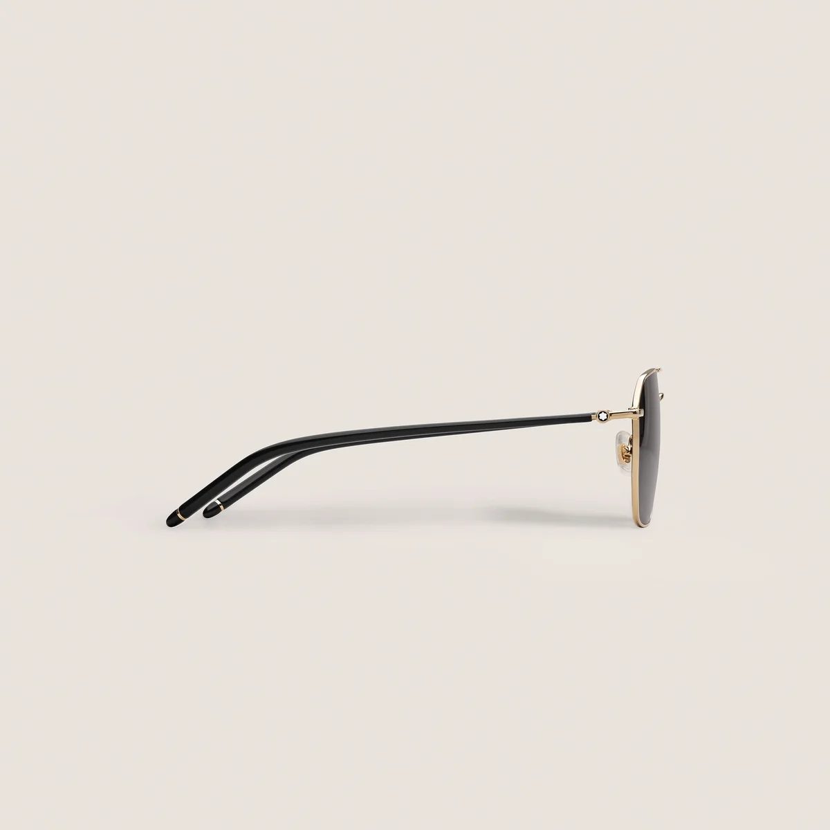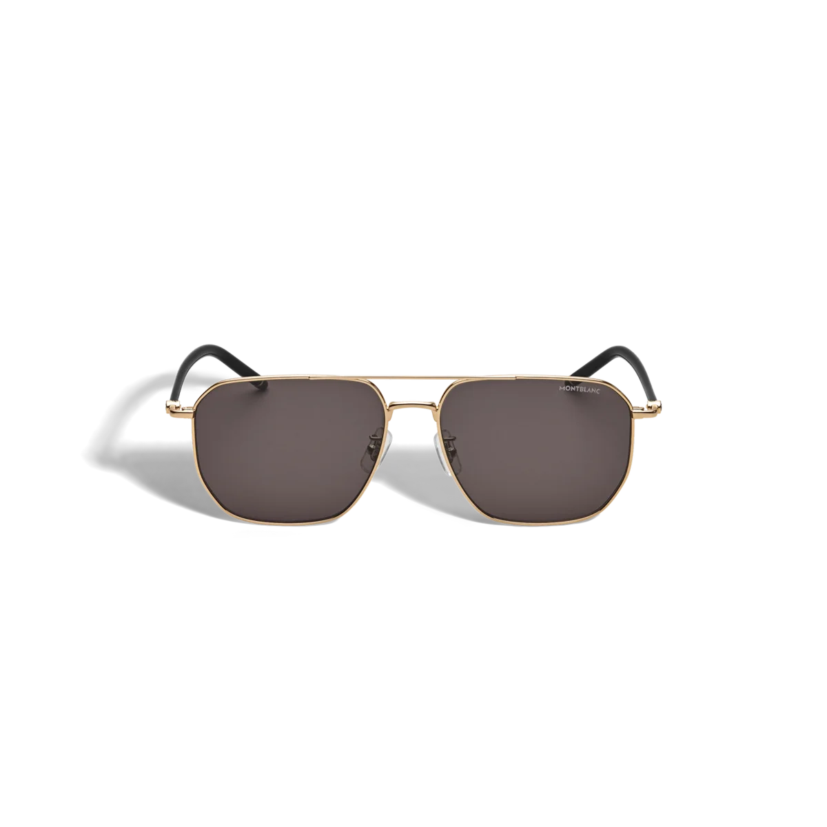 Dessa solglasögon i fyrkantig stil har en guldfärgad metallbåge och grå linser. De har en dubbel metallbrygga på framsidan. De rörformade skalmarna är inspirerade av Meisterstück-skrivinstrumenten och har en detalj med tre ringar. Montblanc-logotypen är lasergraverad på det vänstra glaset och en svart emaljdetalj är infattad i ändarna. Identifieringsnummer MB134414