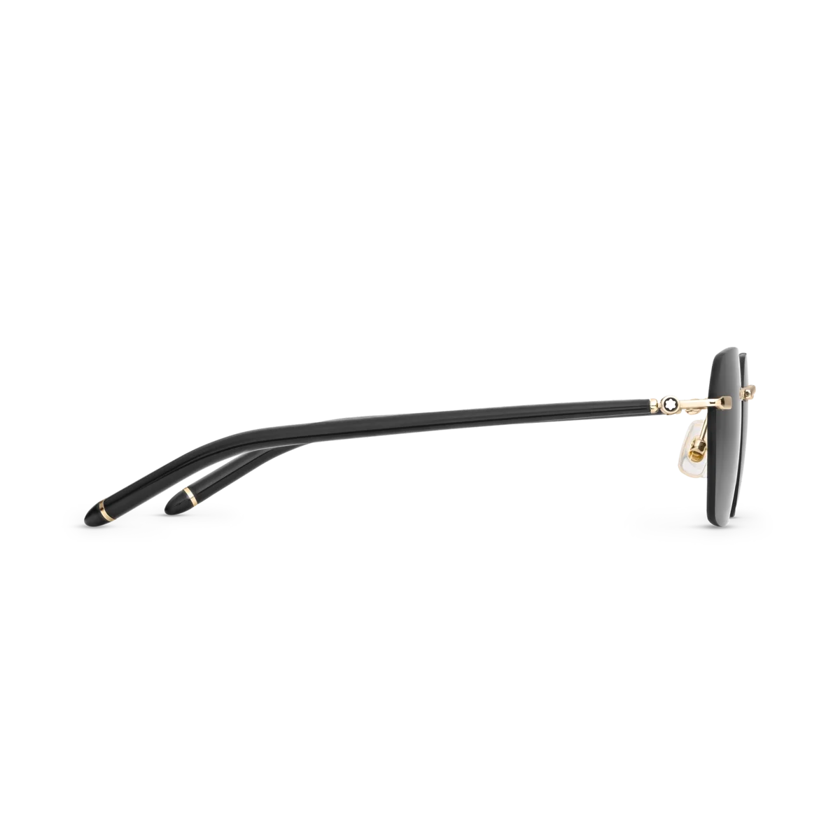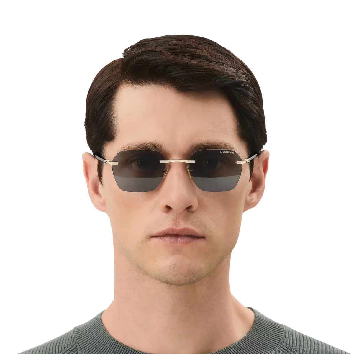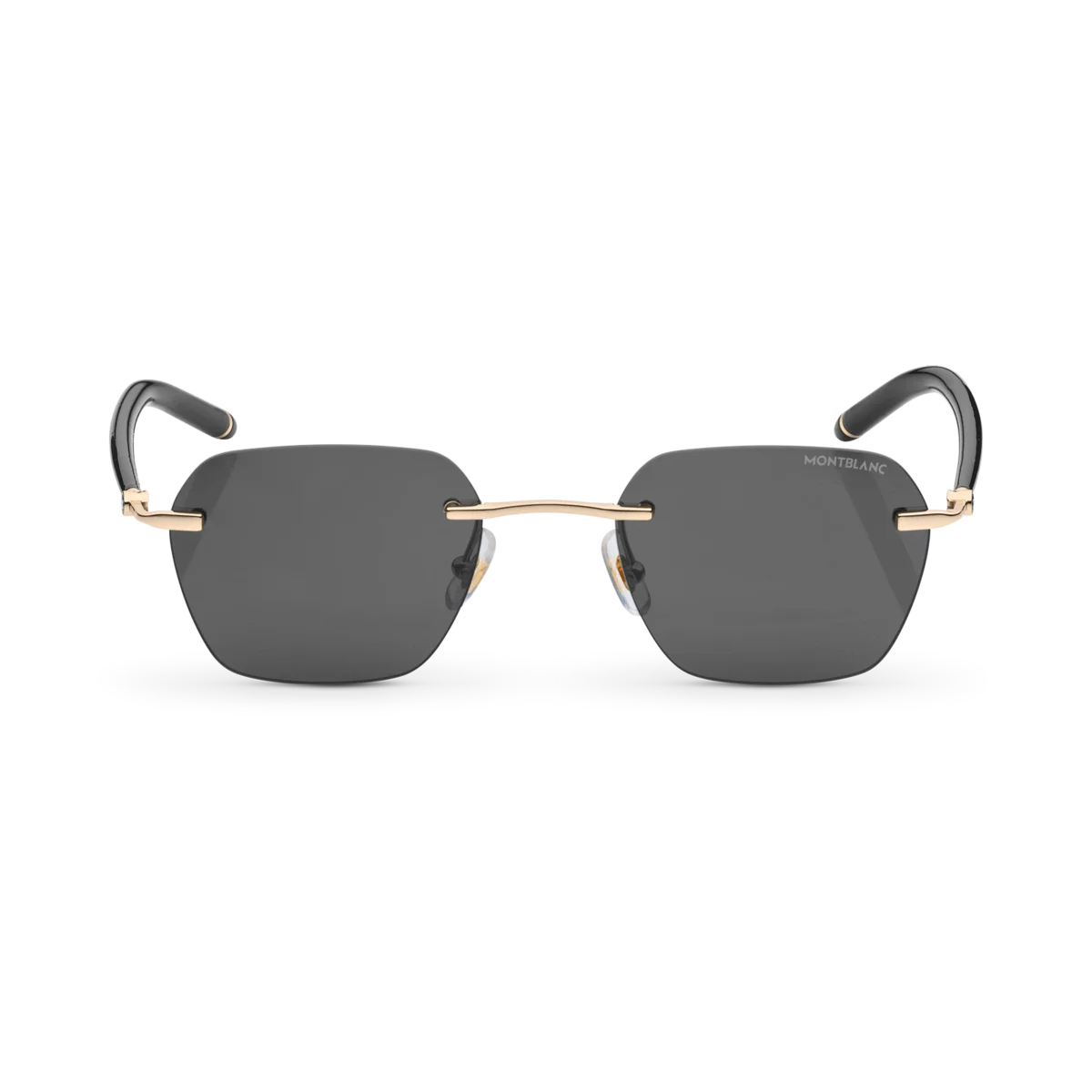 Dessa lätta, kantlösa solglasögon i fyrkantig stil har en guldfärgad metallbåge och grå linser. De rörformade skalmarna är inspirerade av Meisterstück-skrivinstrumenten och har en detalj med tre ringar. Montblanc-logotypen är lasergraverad på det vänstra glaset och snöklädda bergstopp-logotypen är innesluten i skalmarna. Det halkskyddande mönstret är lasergraverat på insidan av skalmarna för ökad komfort.