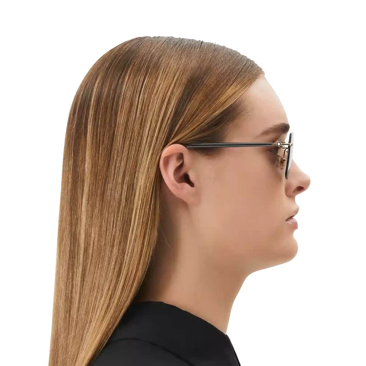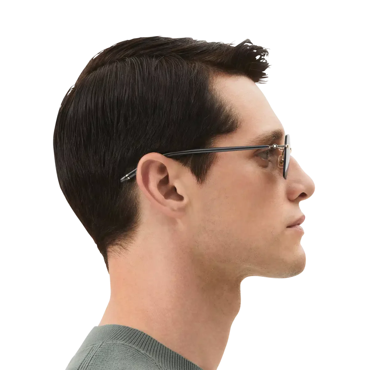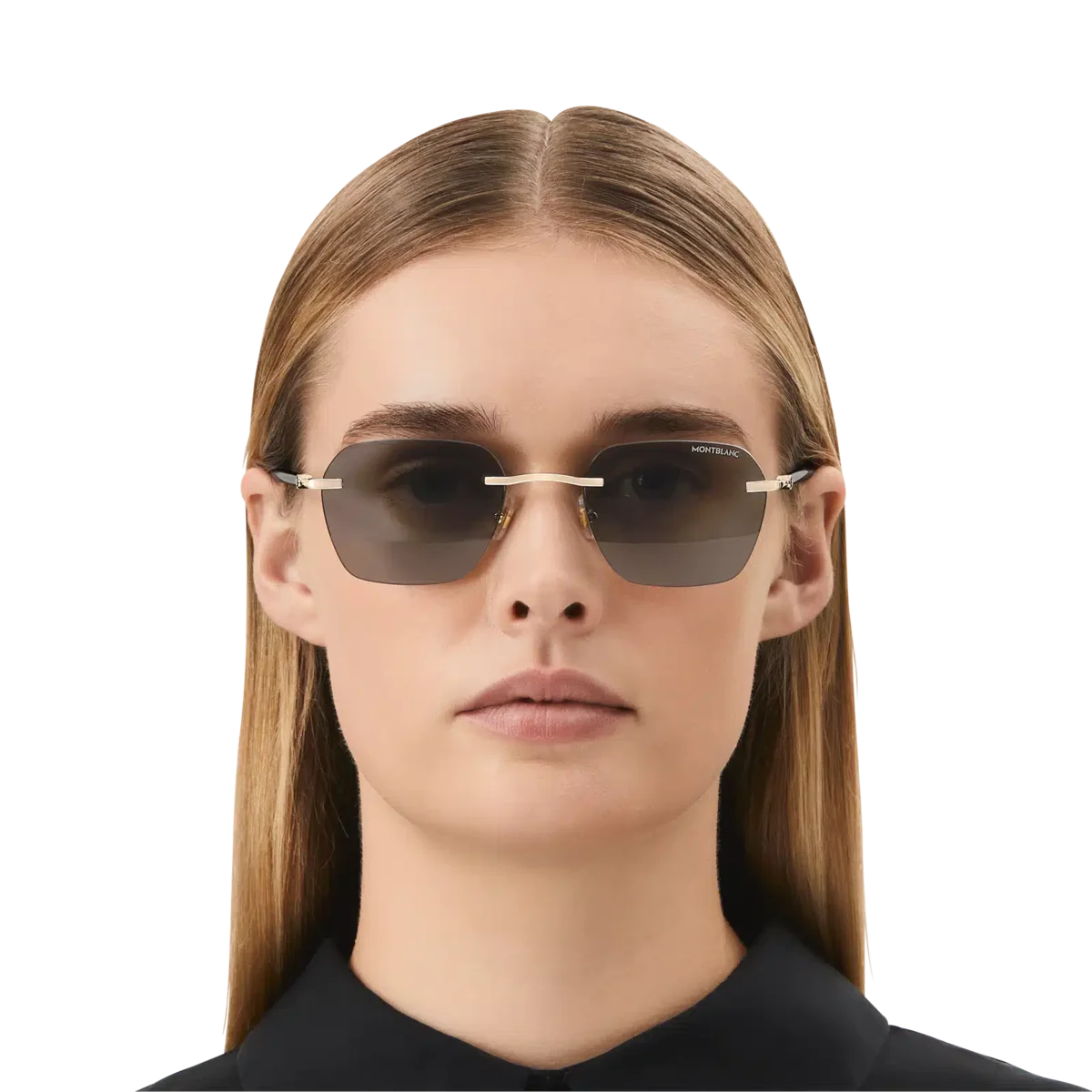Dessa lätta, kantlösa solglasögon i fyrkantig stil har en guldfärgad metallbåge och grå linser. De rörformade skalmarna är inspirerade av Meisterstück-skrivinstrumenten och har en detalj med tre ringar. Montblanc-logotypen är lasergraverad på det vänstra glaset och snöklädda bergstopp-logotypen är innesluten i skalmarna. Det halkskyddande mönstret är lasergraverat på insidan av skalmarna för ökad komfort.
