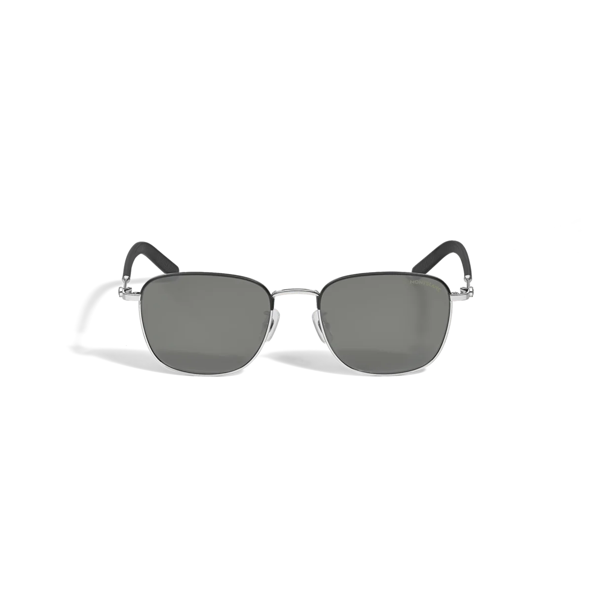 Dessa solglasögon i fyrkantig stil har en silverfärgad metallram och grå linser. Montblanc-emblemet är inneslutet i skalmarna. Montblanc-logotypen är lasergraverad på solglasögonens vänstra lins och det halkfria mönstret är lasergraverat på insidan av skalmarna för ökad komfort.