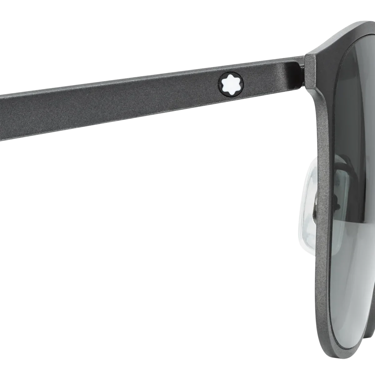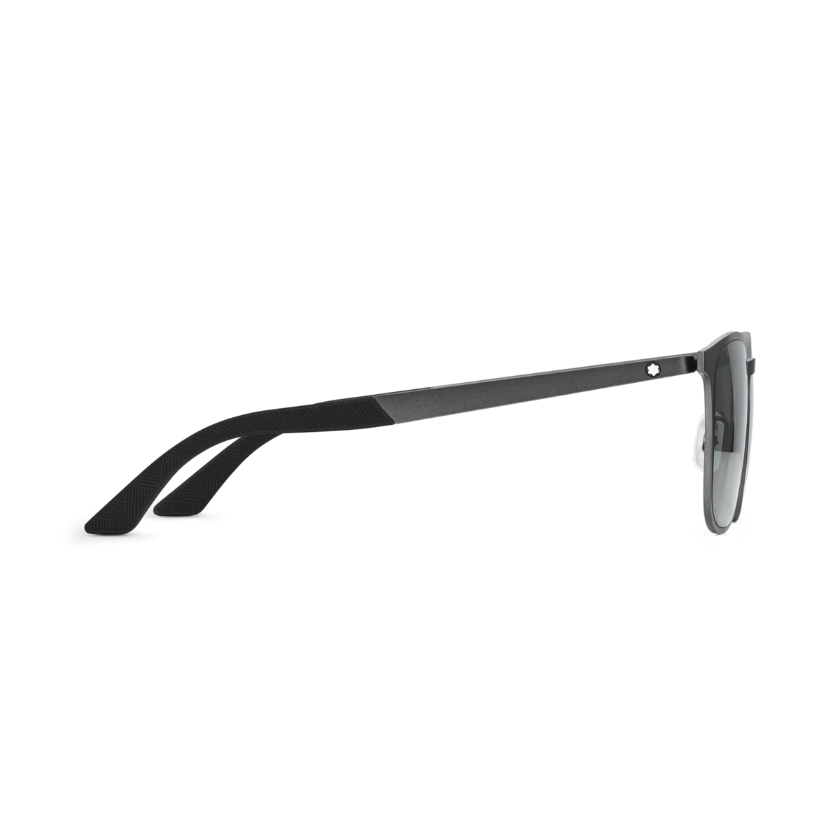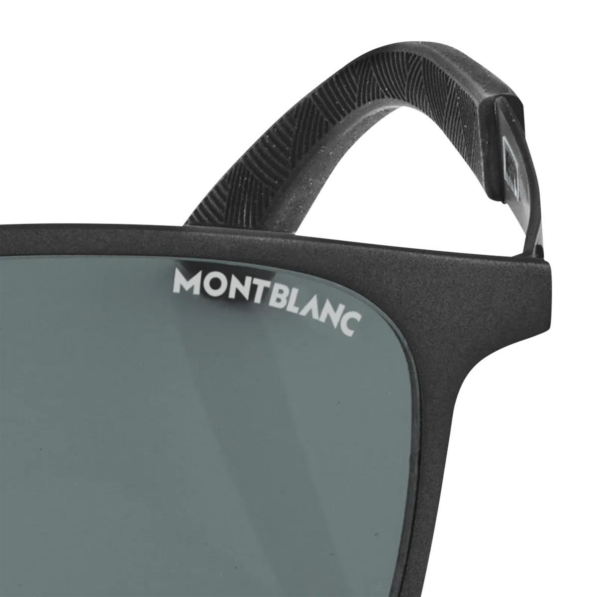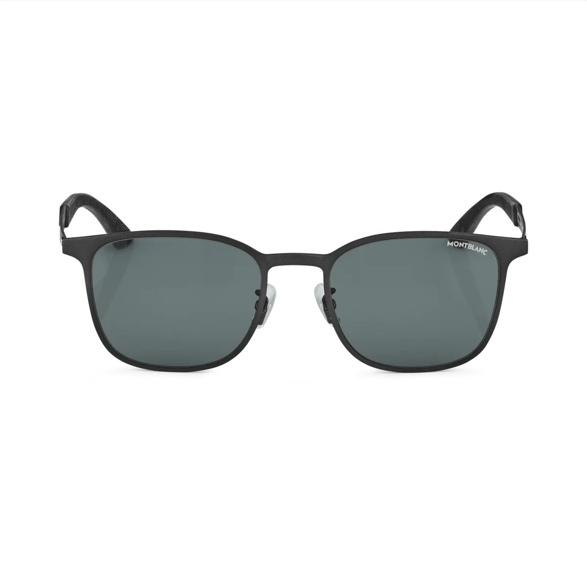 Dessa fyrkantiga solglasögon har en svart metallram och grå linser. Montblanc-emblemet är inneslutet i skalmsdesignen med gummiband i ändarna med Montblanc Extreme 3.0-mönster för en sportig look. Montblanc-logotypen är lasergraverad på solglasögonens vänstra lins.
