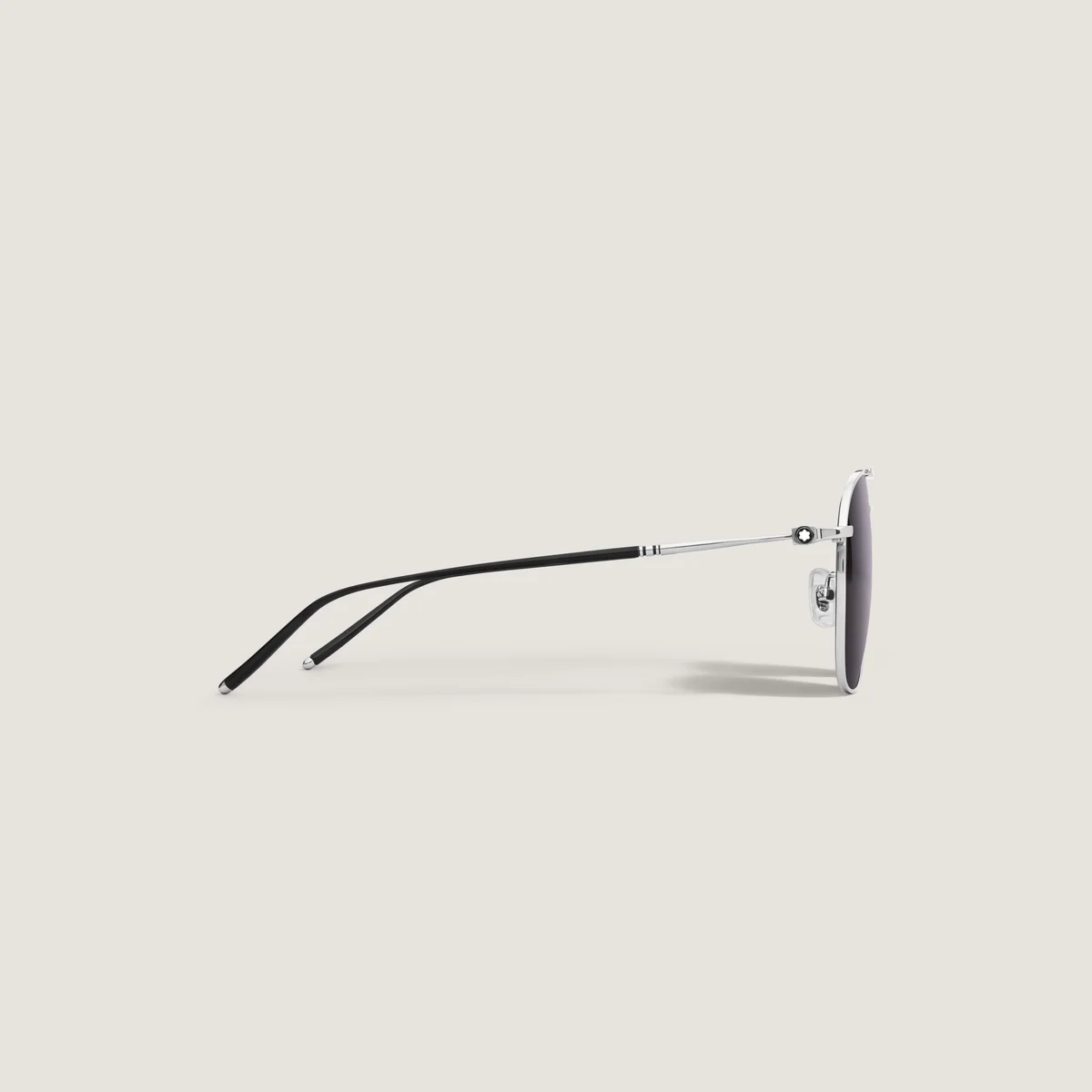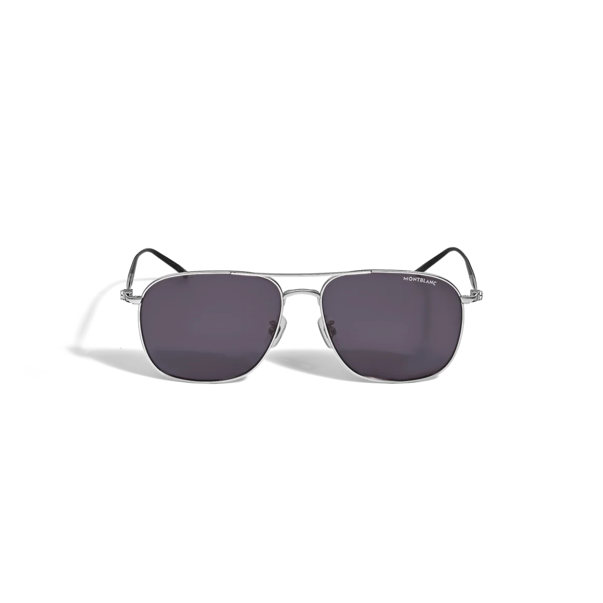 Dessa solglasögon i fyrkantig stil har en silverfärgad metallbåge och blå linser. De har en dubbel metallbrygga på framsidan. De rörformade skalmarna är inspirerade av Meisterstück-skrivinstrumenten och förgylls av en detalj med tre ringar. Montblanc-logotypen är lasergraverad på det vänstra glaset och en svart emaljdetalj är infattad i ändarna. Identifieringsnummer: MB135562