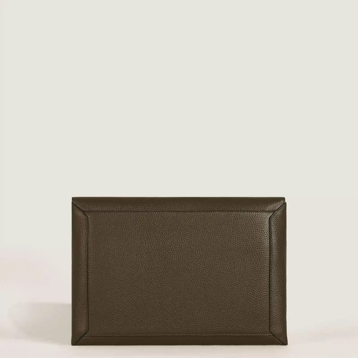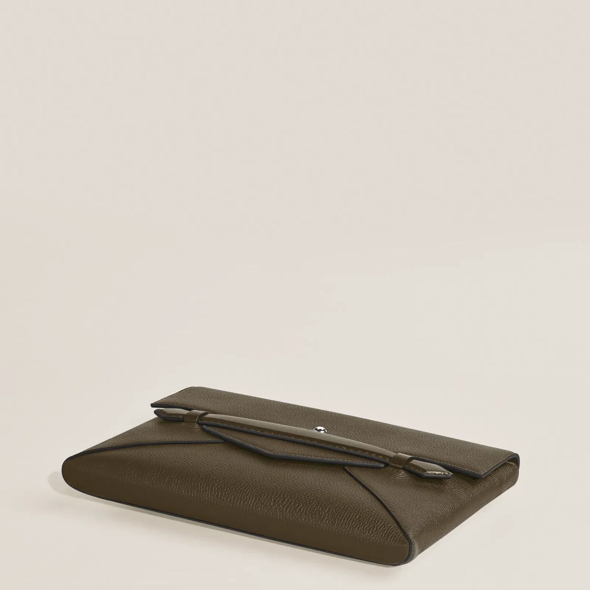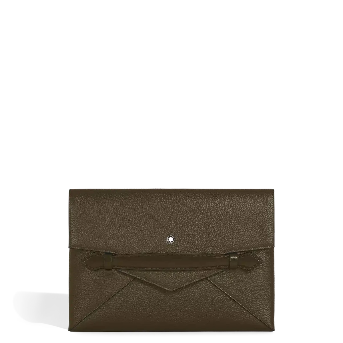 Denna dokumenthållare är designad för dem som söker elegans i alla aspekter av livet och är tillverkad av khakifärgat kalvskinn. Den eleganta kuvertinspirerade formen förhöjs av ett pennspetsformat handtag på framsidan, vilket tillför en touch av Montblancs arv till världen av moderna accessoarer. Huvudfacket har en öppen ficka och två pennfickor för organisering, medan den bakre fickan ger enkel åtkomst till nödvändiga saker.
