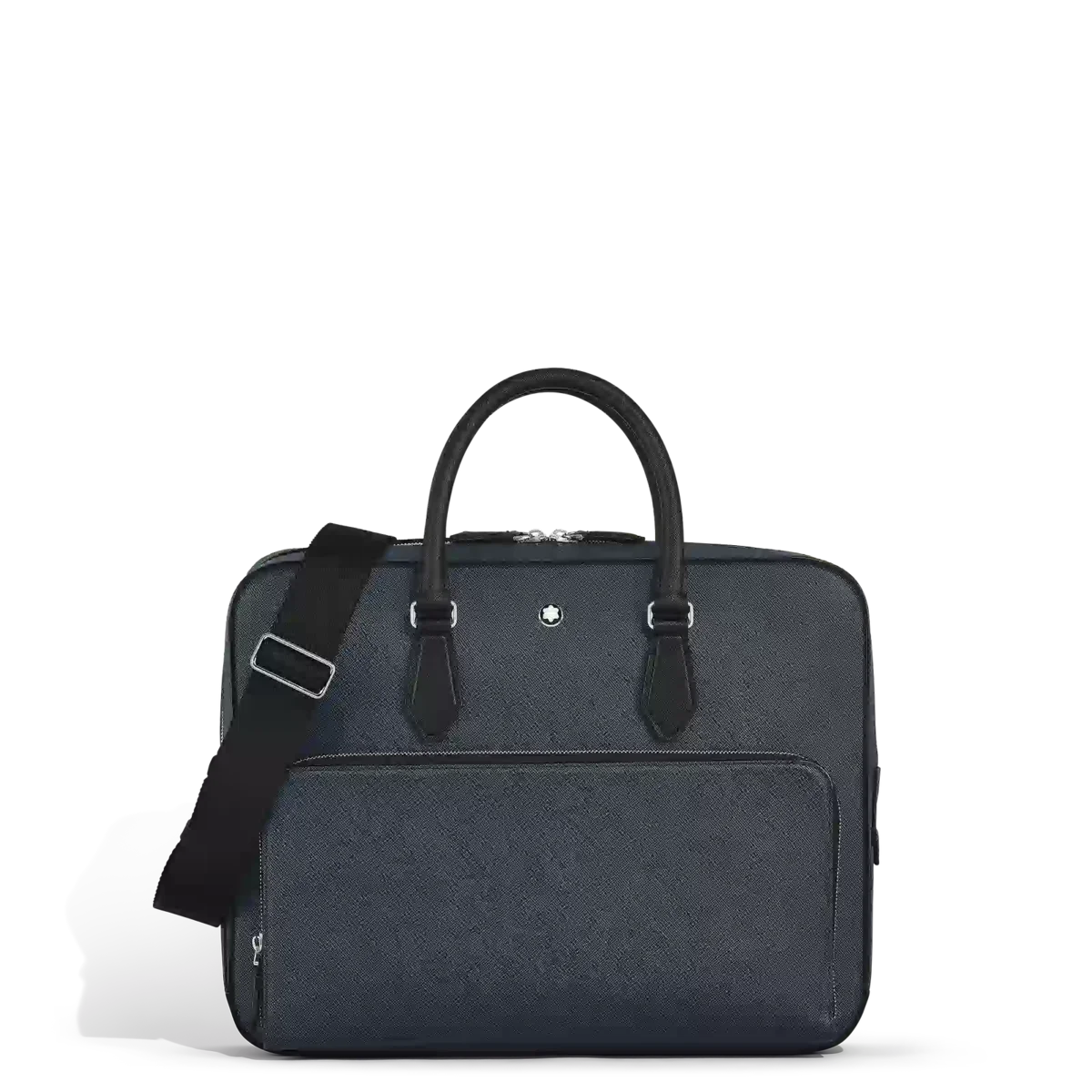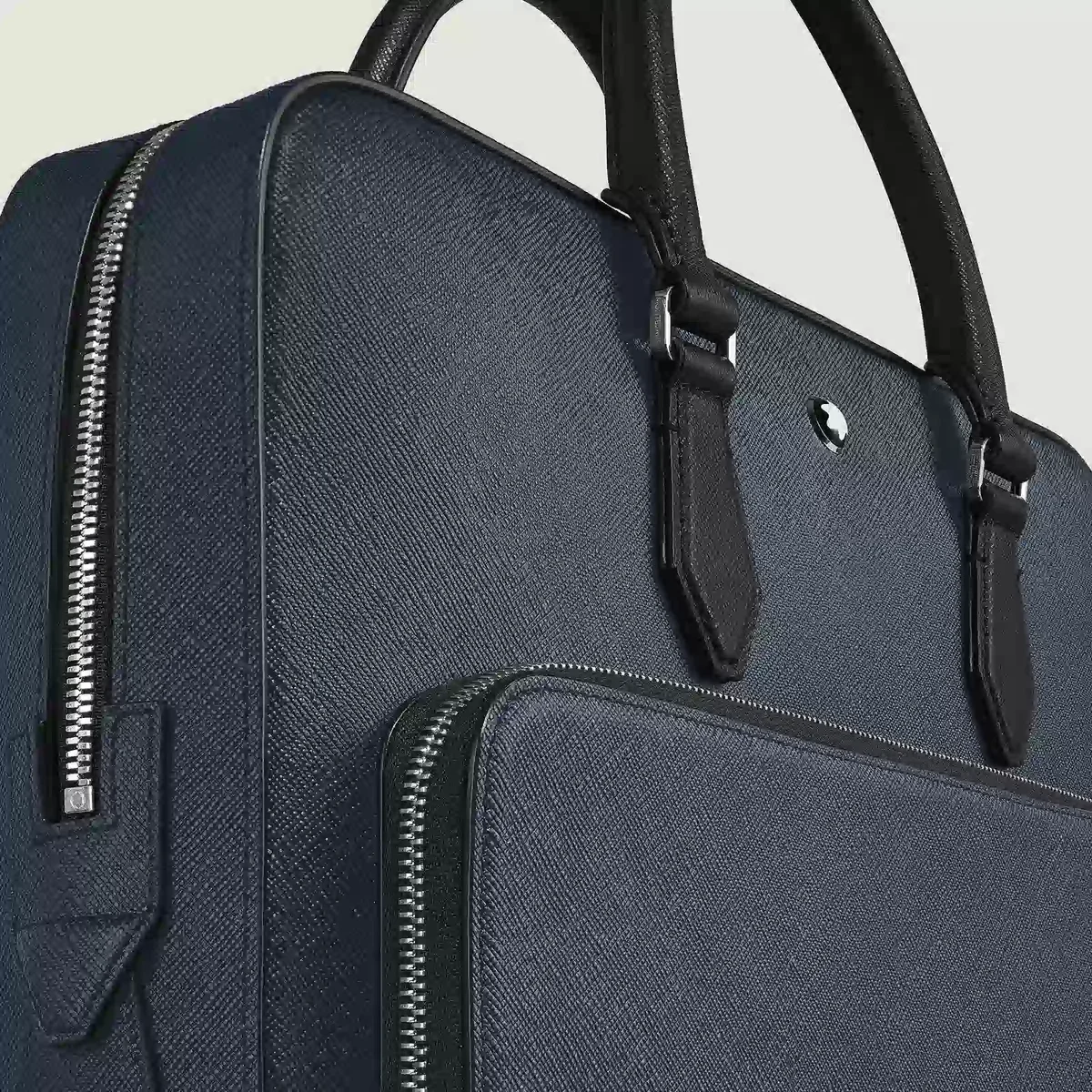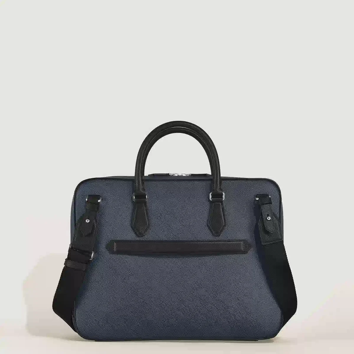 Denna eleganta väska har ett rymligt huvudfack för transport av A4-dokument, bärbara datorer upp till 13 tum, elektroniska enheter och andra professionella nödvändigheter med stil. Den är tillverkad av tvåfärgat präglat Sartorial-läder i svart och blått och är noggrant utformad för affärsbehov. Dina skrivinstrument kan förvaras i särskilda öglor, medan andra tillhörigheter kan förvaras säkert i en ficka med dragkedja eller i de två extra öppna fickorna.