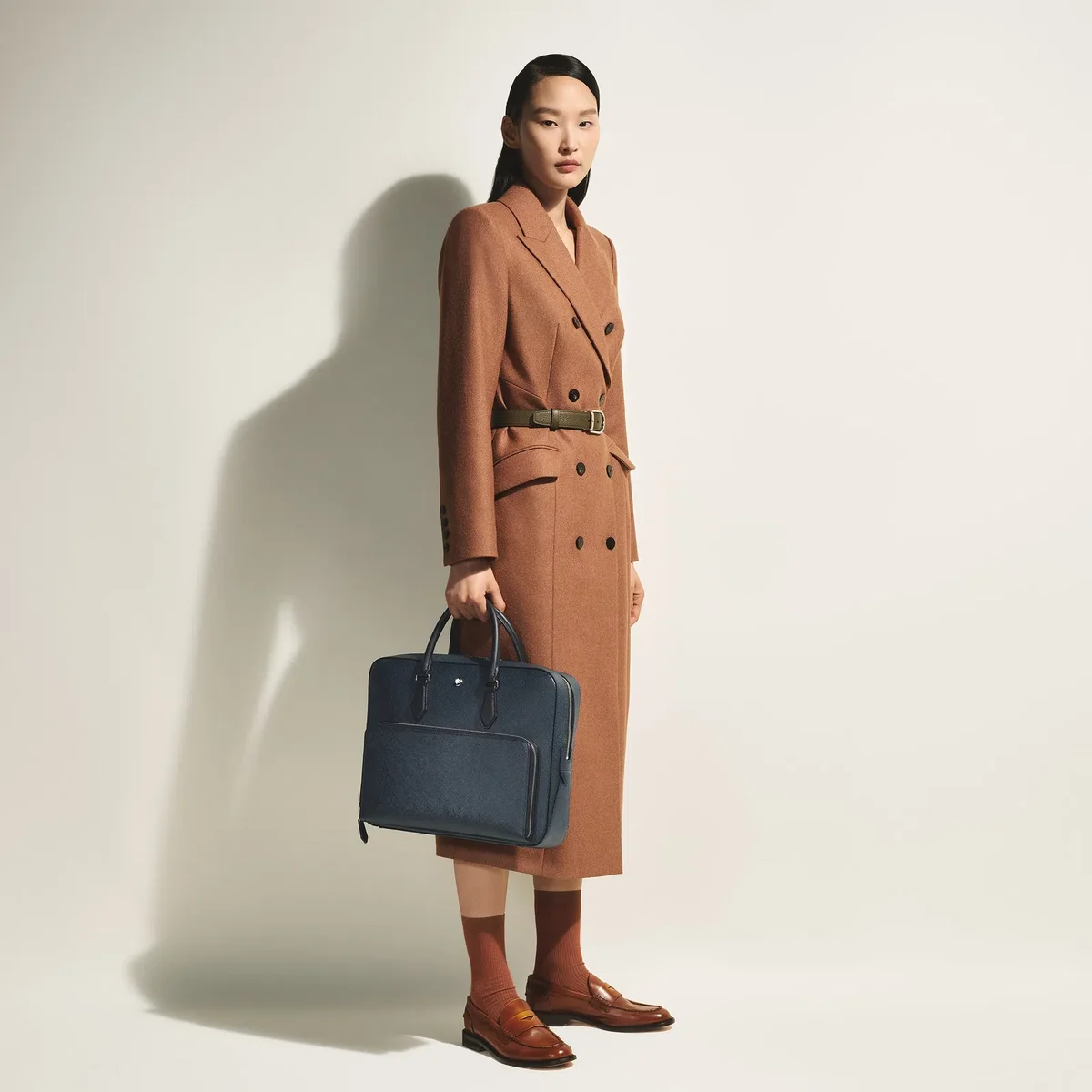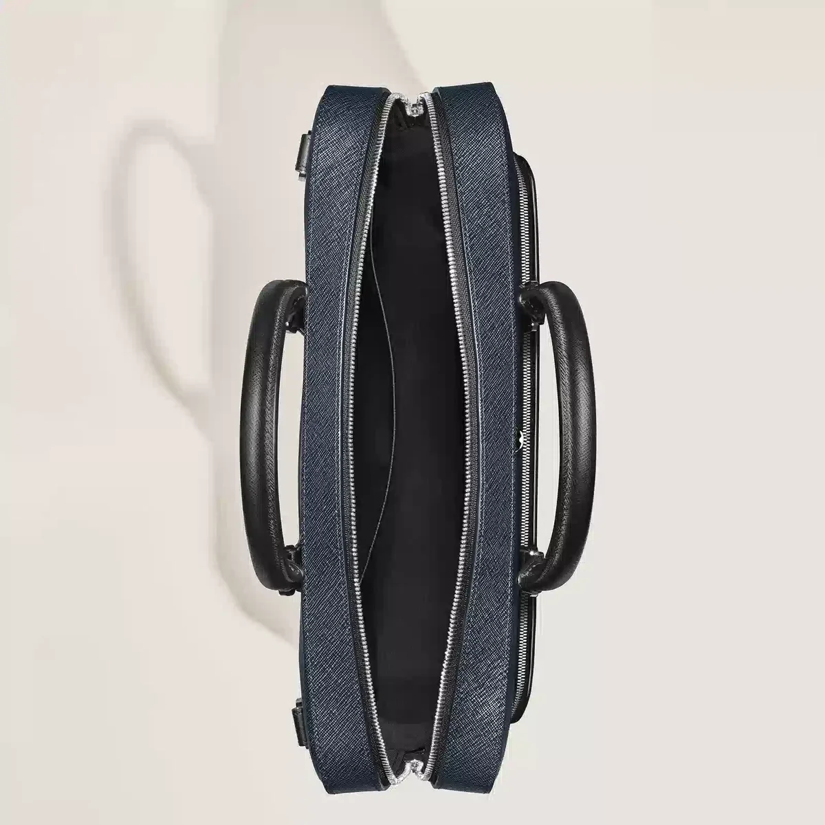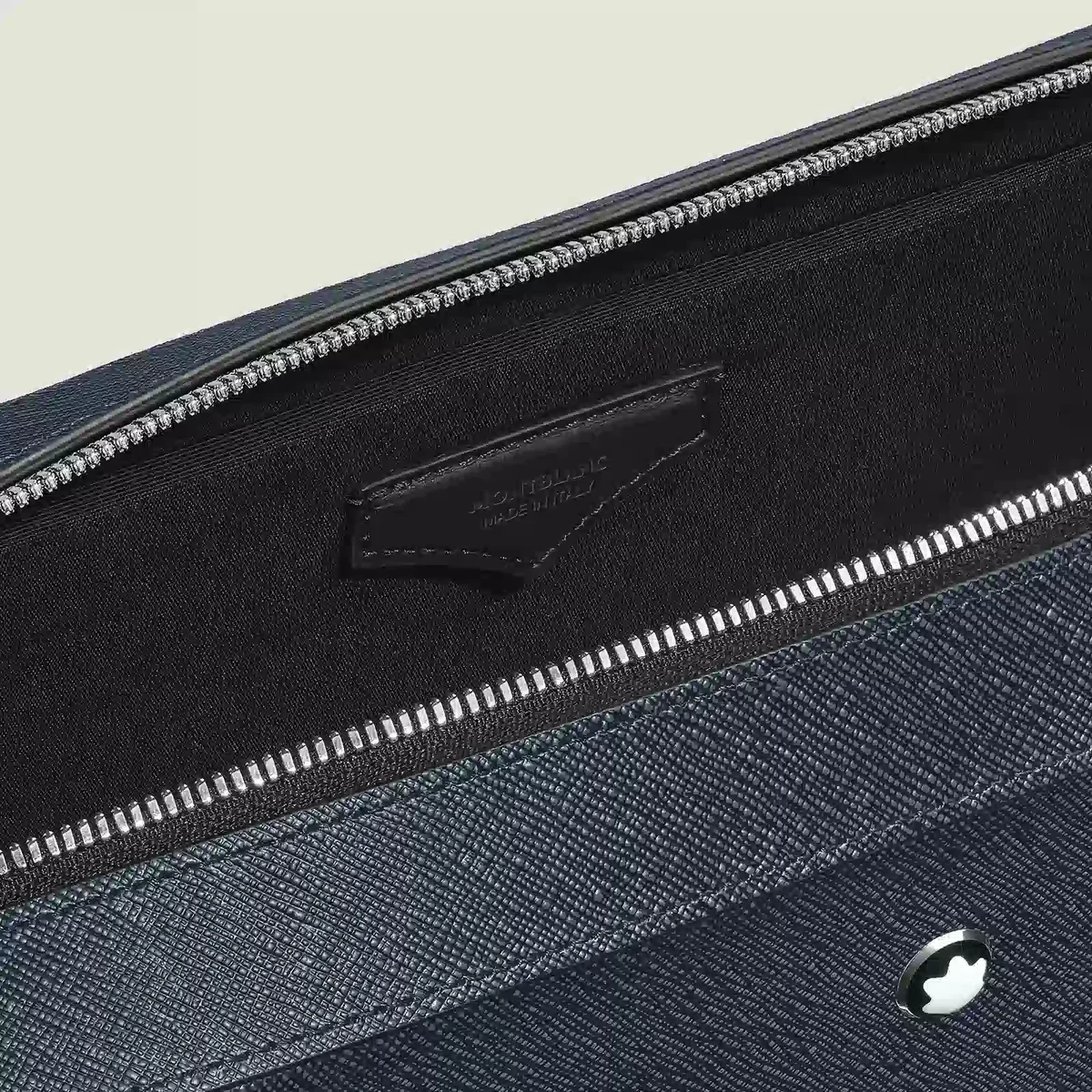 Denna eleganta väska har ett rymligt huvudfack för transport av A4-dokument, bärbara datorer upp till 13 tum, elektroniska enheter och andra professionella nödvändigheter med stil. Den är tillverkad av tvåfärgat präglat Sartorial-läder i svart och blått och är noggrant utformad för affärsbehov. Dina skrivinstrument kan förvaras i särskilda öglor, medan andra tillhörigheter kan förvaras säkert i en ficka med dragkedja eller i de två extra öppna fickorna.