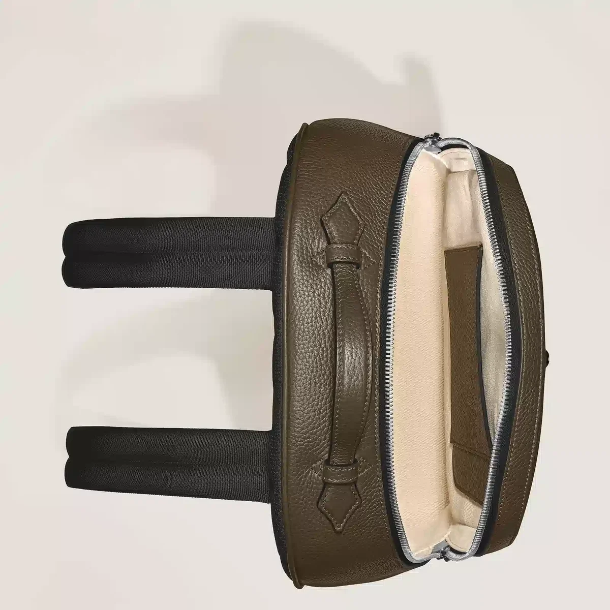 Denna lyxiga ryggsäck i khakifärgat läder är en sofistikerad följeslagare för dagliga pendlingar eller korta affärsresor. Den är tillverkad i kornigt läder med mjuka former och har signaturdetaljer som pennspetsformade dragkedjor och raffinerade sömmar. De mångsidiga bäralternativen inkluderar justerbara axelremmar och ett satellitsystem för enkel fastsättning på större bagage. Det rymliga huvudfacket är utformat för smidig organisering och har ett vadderat fack för bärbara datorer upp till 13 tum, en öppen ficka och en pennslinga för att hålla mindre nödvändigheter inom räckhåll. Identifieringsnummer MB220194 Mått 315 mm * 140 mm * 410 mm